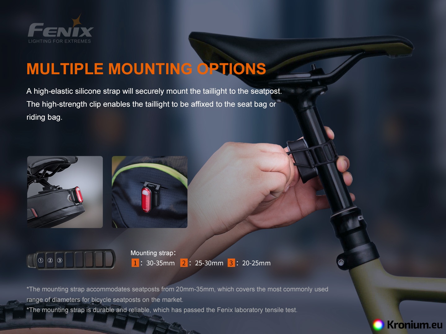 The design of the mount allows quick mounting and dismounting of the light on the bike without tools. The clamp fits a seat tube with a diameter of 20 to 35 millimeters. With 5 lumens of power in the fast flash mode, the light lasts up to 120 hours, the Fenix BC05R V2.0 will provide safe lighting for night training, regular commuting and endurance racing.