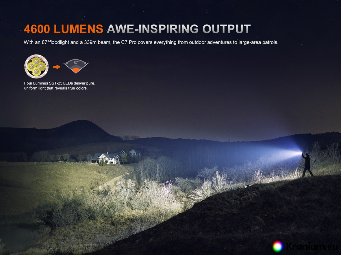 - The flashlight is equipped with four premium Luminus SST-25 LEDs with a lifespan of 50,000 hours.
