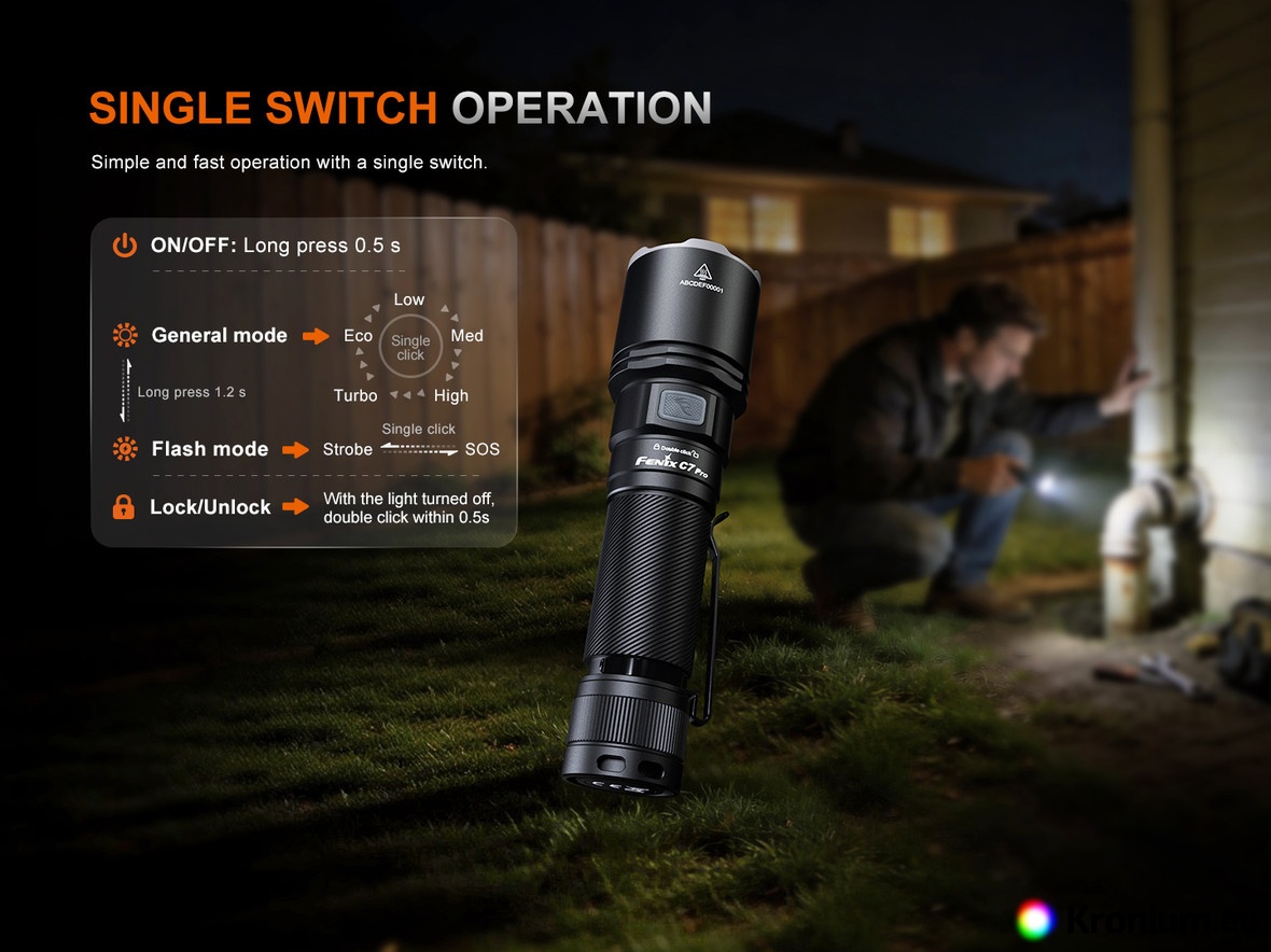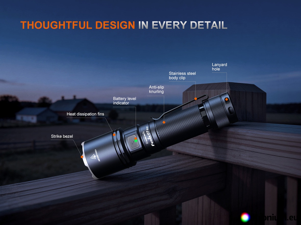 The flashlight boasts well-thought-out ergonomics and extraordinary versatility. Seven lighting modes give you ultimate control – from blinding maximum output to an eco mode lasting more than three days of continuous illumination. A strobe mode is available for crisis situations and self-defense, alongside an SOS signal. A major advantage is its magnetic tail cap, which allows you to easily attach the flashlight to anything iron, freeing your hands for work. Stable performance is ensured by digitally regulated constant current circuitry, which prevents the light from dimming even as the battery gradually discharges. Thanks to its premium build quality and excellent price-to-performance ratio, the Fenix C7 PRO is the perfect tool for industrial applications, home DIY projects, and as an ideal outdoor companion for demanding adventures.