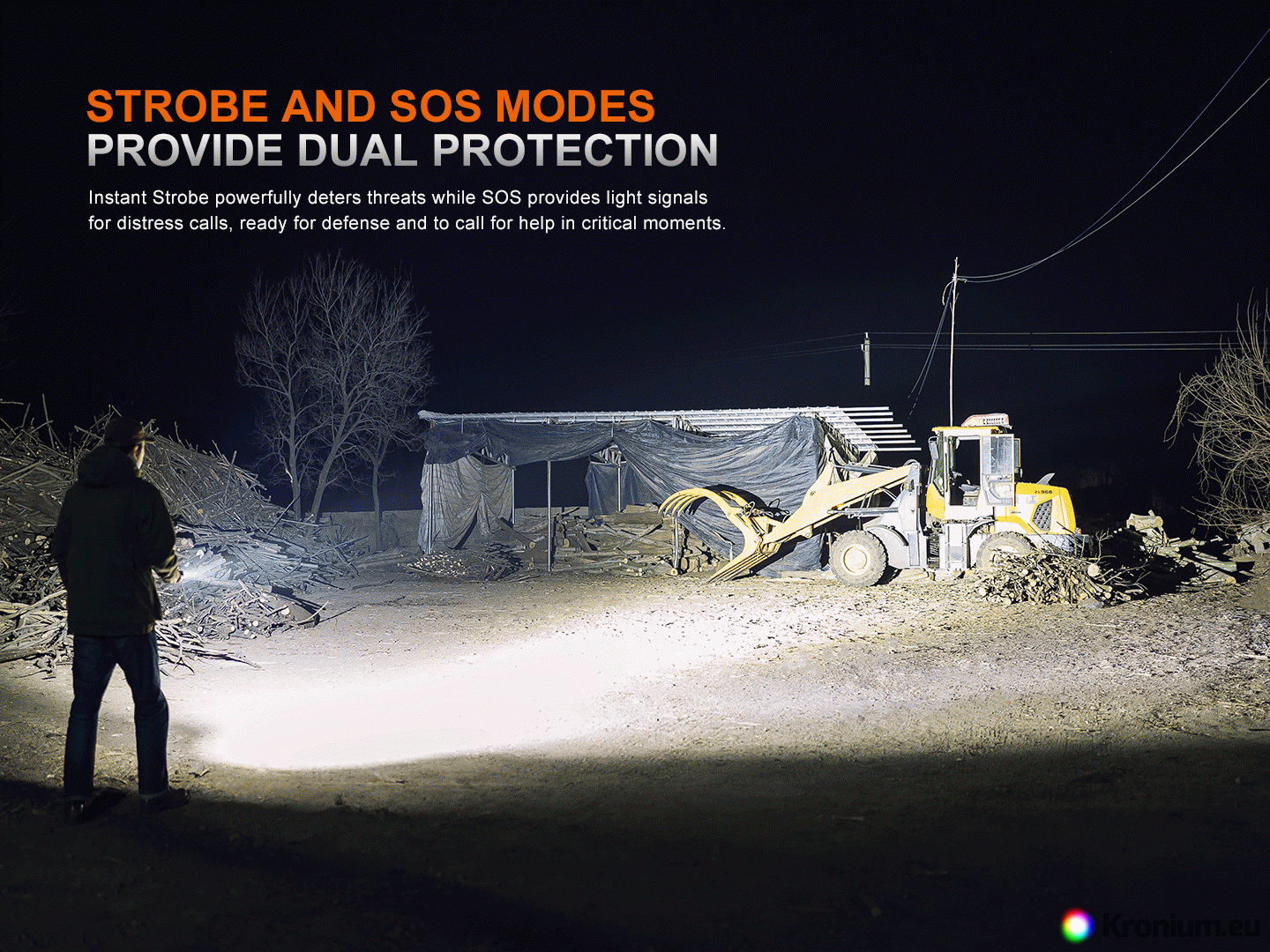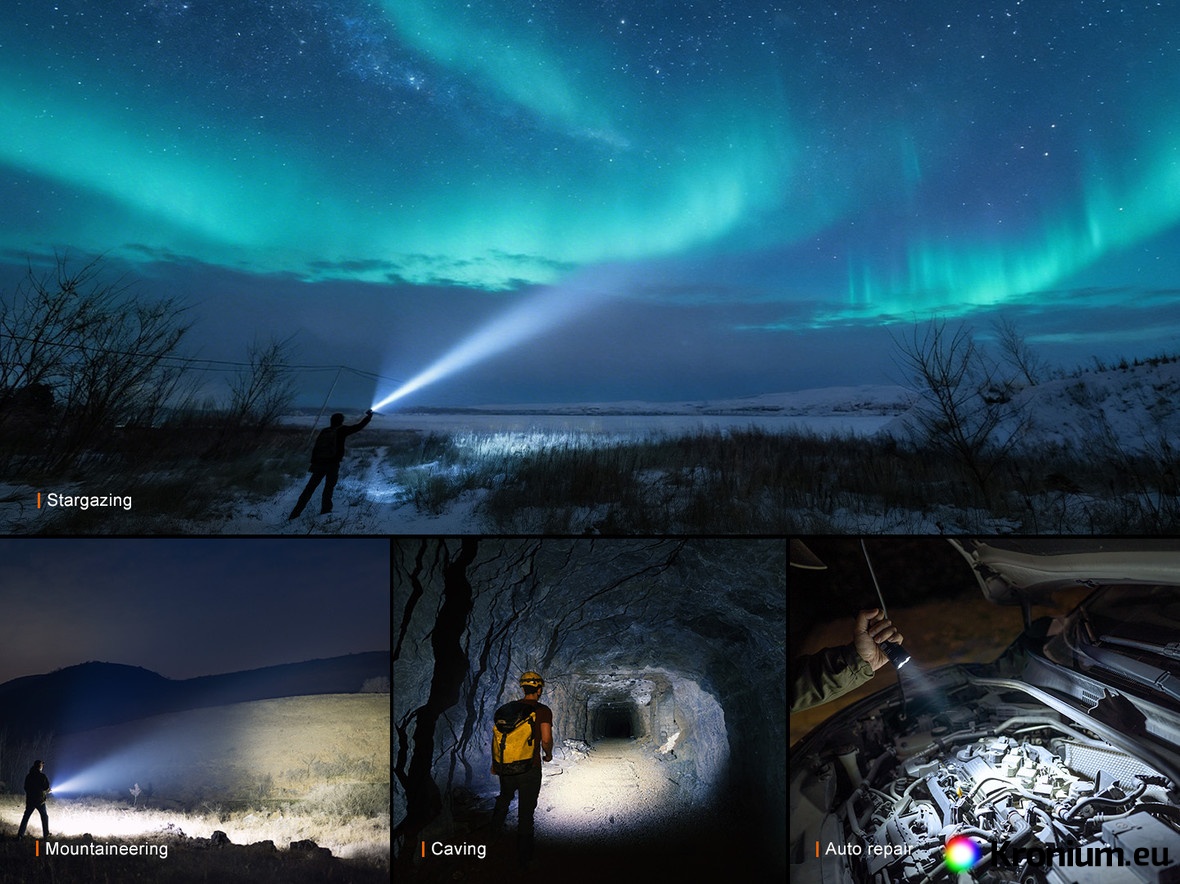 - Seven white light modes: 4600 lumens (1 h 48 min) - 2000 lumens (2 h 12 min) - 600 lumens (5 h 56 min) - 100 lumens (35 h 27 min) - 30 lumens (85 h 30 min) - strobe (2500 lumens) - SOS (100 lumens).