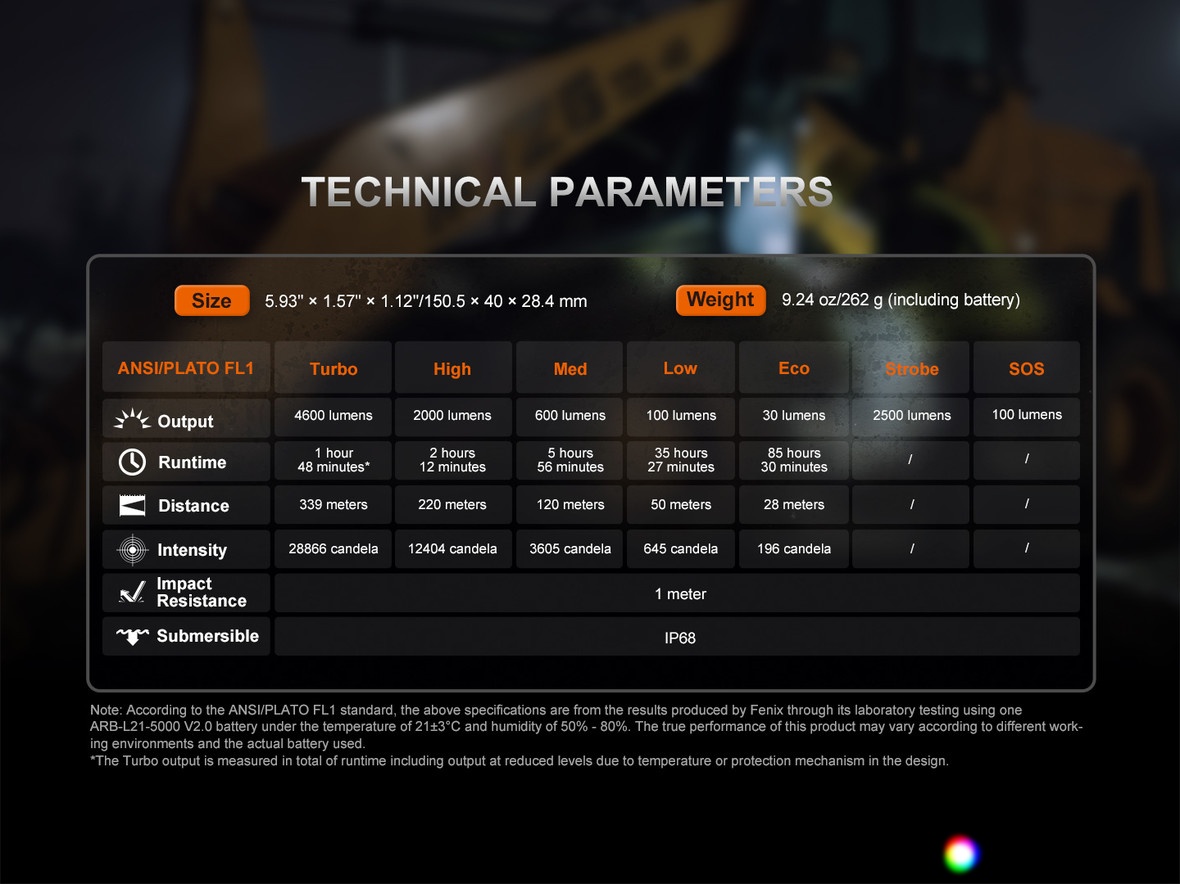All flashlight parameters (luminous output, battery runtime, waterproofing, beam distance, and impact resistance) are measured in accordance with the ANSI/NEMA FL 1-2009 standard.