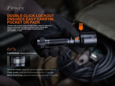 Button lock - if you want to prevent the flashlight from accidentally turning on in luggage, press the button twice quickly within 0.5 seconds (the flashlight must be off), the flashlight will then flash twice in low mode and cannot be turned on. Unlocking is done by pressing the button again quickly twice. Accidental switching on can also be prevented by loosening the battery cap of the flashlight.
