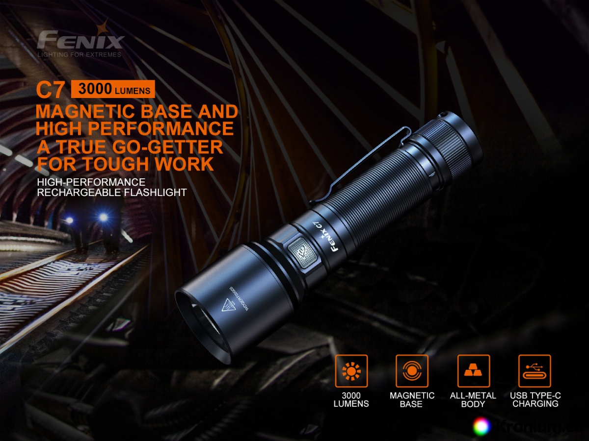 Fenix C7 is a high-performance rechargeable flashlight that offers a lumen output of up to 3000 lumens (ANSI) and a range of up to 470 meters. Excellent performance has been achieved by using a state-of-the-art LED Luminus SST-70. The 21700 high-capacity Li-ion battery with 5000 mAh capacity (included), which is charged directly in the flashlight via a modern USB-C connector. The flashlight was designed with ease of use and broad usability in mind. The seven light functions allow you to choose between high power and a long almost three days battery life. There is also a blinding strobe and a SOS signal for emergency situations. The Fenix C7 is powered by a digitally controlled constant current to guarantee a constant light output even when the voltage in the battery is reduced (when they are slowly discharging). Switching on and switching modes is very simple and is done by a button ergonomically placed on the side. The tail of the flashlight is magnetic, so it can be easily attached to anything metal. The flashlight is an ideal light tool with an excellent ratio of high performance, quality and price. Its versatility makes it recommended for work in industries, home workshop, but at the same time it is an ideal outdoor partner for hiking and various sports activities.