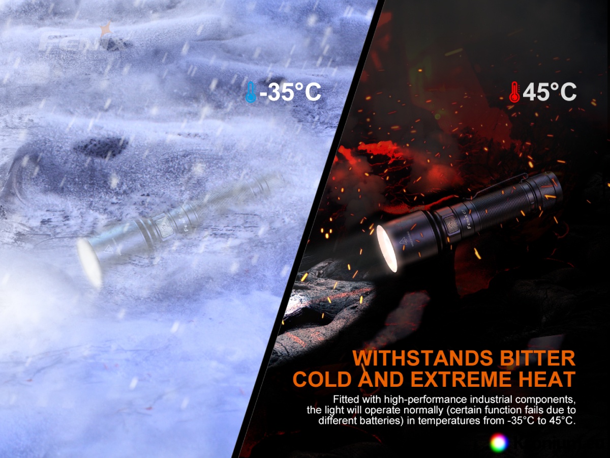 - The flashlight comes with a Fenix ARB-L21-5000 battery, USB-C charging cable, wrist lanyard, and spare o-ring.