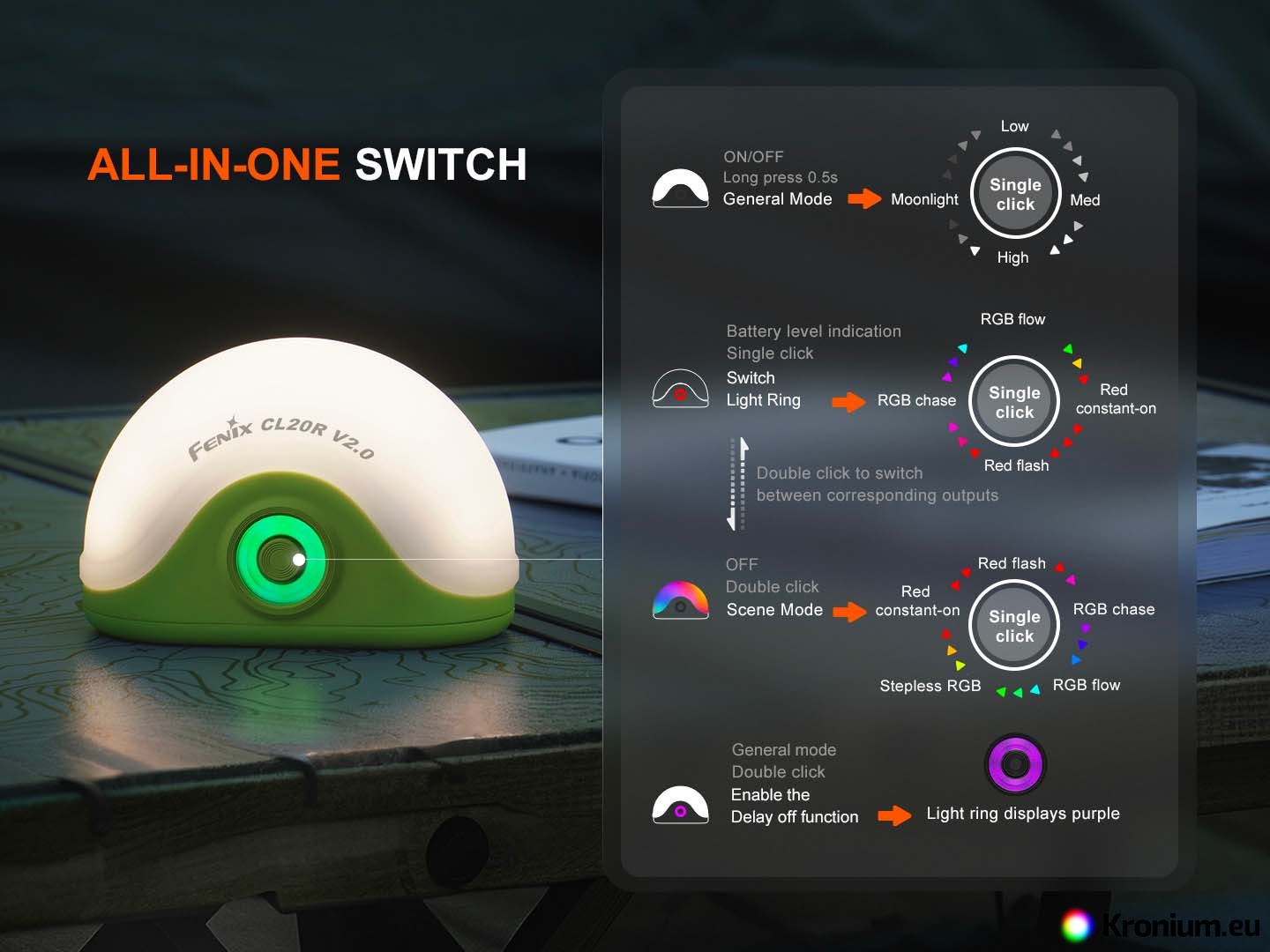 On/Off and Switching Modes - The lantern turns on in white light mode by holding the switch for 0.5 seconds. To turn on the color modes, double-press the switch quickly. To activate the light ring, press the switch once, then again within 3 seconds. The individual lighting modes of the selected type are cycled through by pressing the switch. The lantern is turned off by holding the switch for 0.5 seconds.