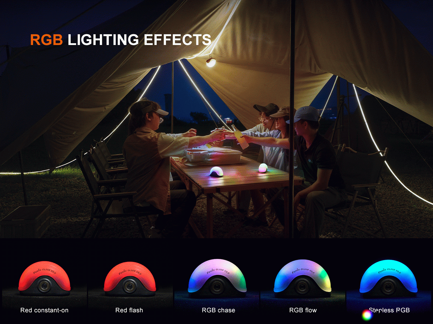 - Five red and RGB light modes: Stepless RGB 25 lumens (6.7 hours) -> RGB chase 12 lumens (10 hours) -> RGB flow 10 lumens (10 hours) -> red light 1.5 lumens (40 hours) -> red flash 1.5 lumens (80 hours).