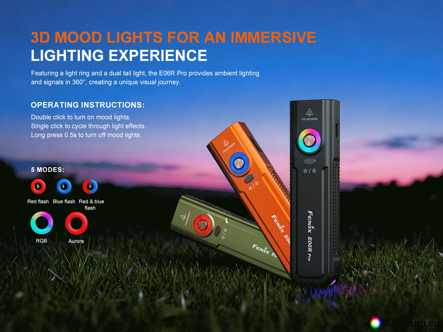 Colored button backlight and tail light - The 3D light ring around the main button incl. lights in the flashlight tail can be turned on by double-clicking the main button quickly when the flashlight is off. Subsequent presses of the button cycle through five functions – Red flash → Blue flash → Red and Blue flash → RGB light → Aurora. The light ring is turned off again by holding the main button for 0.5 seconds.