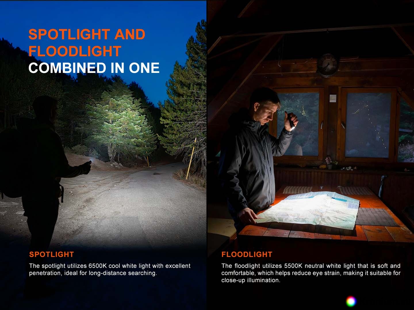 - Five white spotlight modes: 1000 lumens (2.25 hours) -> 350 lumens (2.5 hours) -> 150 lumens (4.5 hours) -> 30 lumens (24 hours) -> 5 lumens (104 hours)