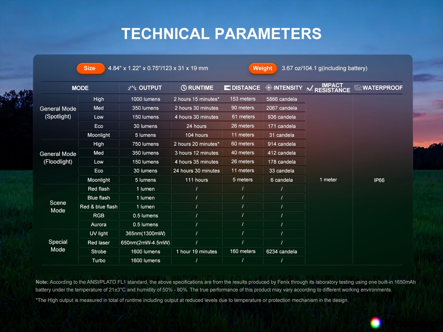 All flashlight parameters (luminous flux, battery runtime, waterproofing, impact resistance, and beam range) are measured in accordance with the ANSI/NEMA FL 1-2009 standard.