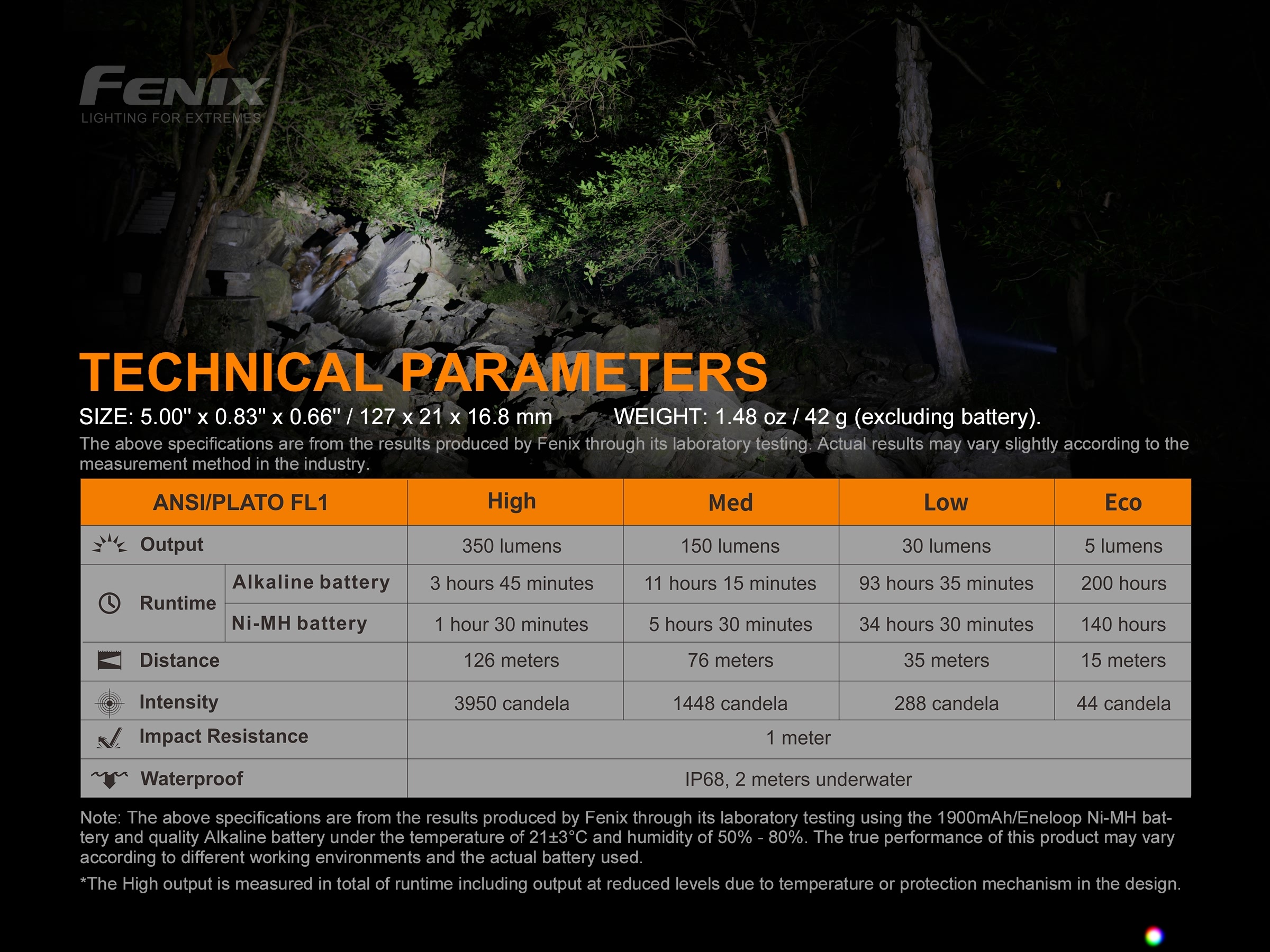 All flashlight parameters (lumen output, battery life, waterproof, range and shock resistance) are measured in accordance with ANSI/NEMA FL 1-2009.