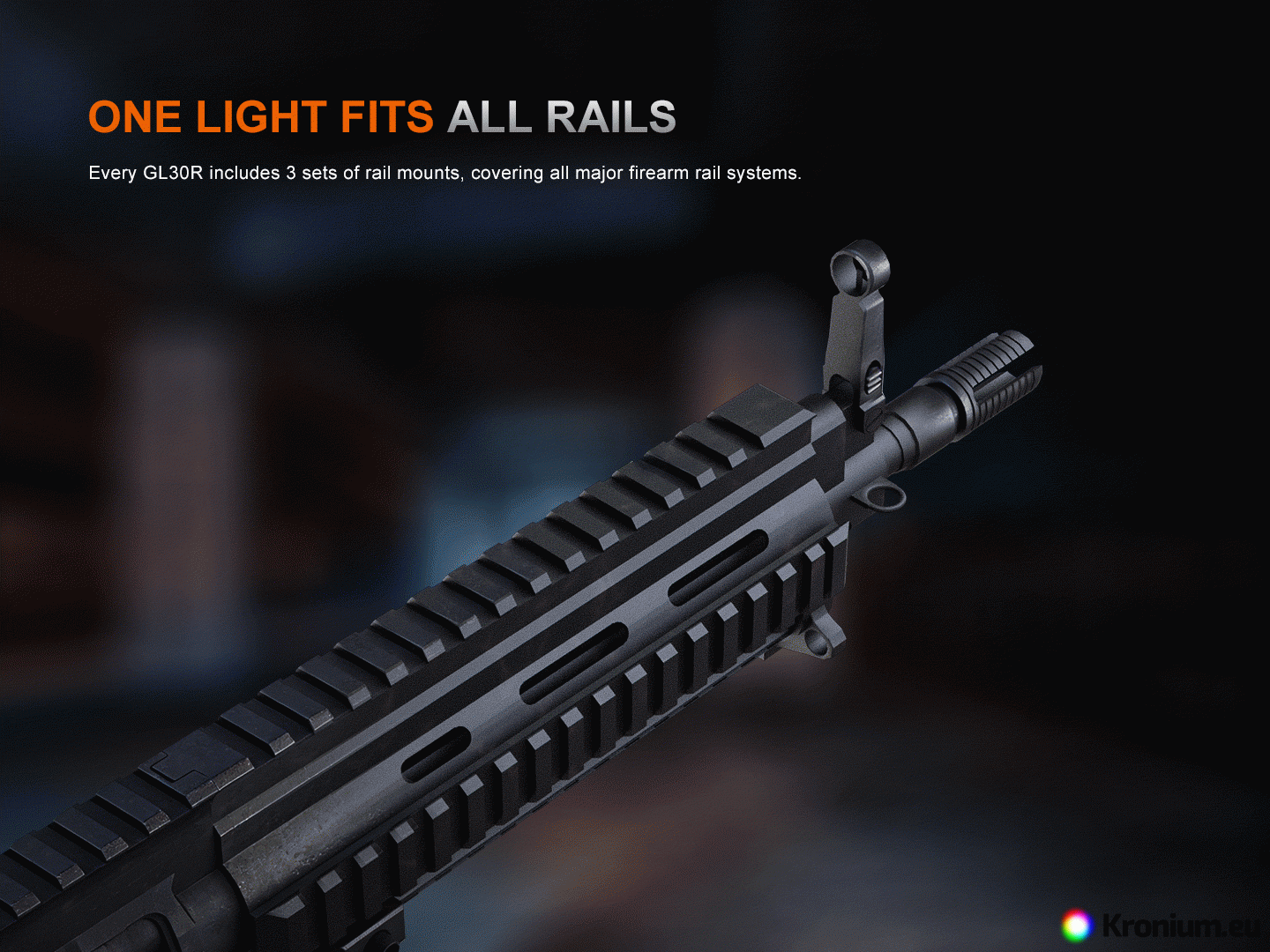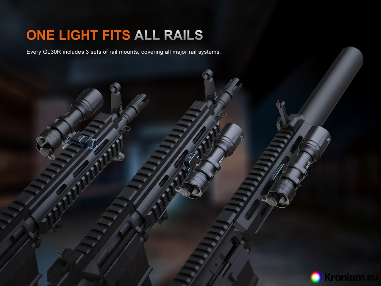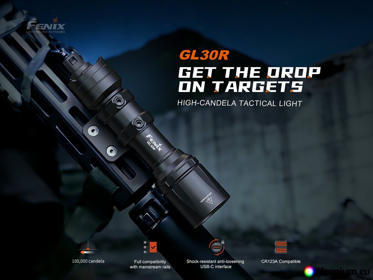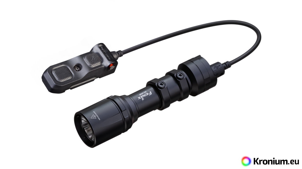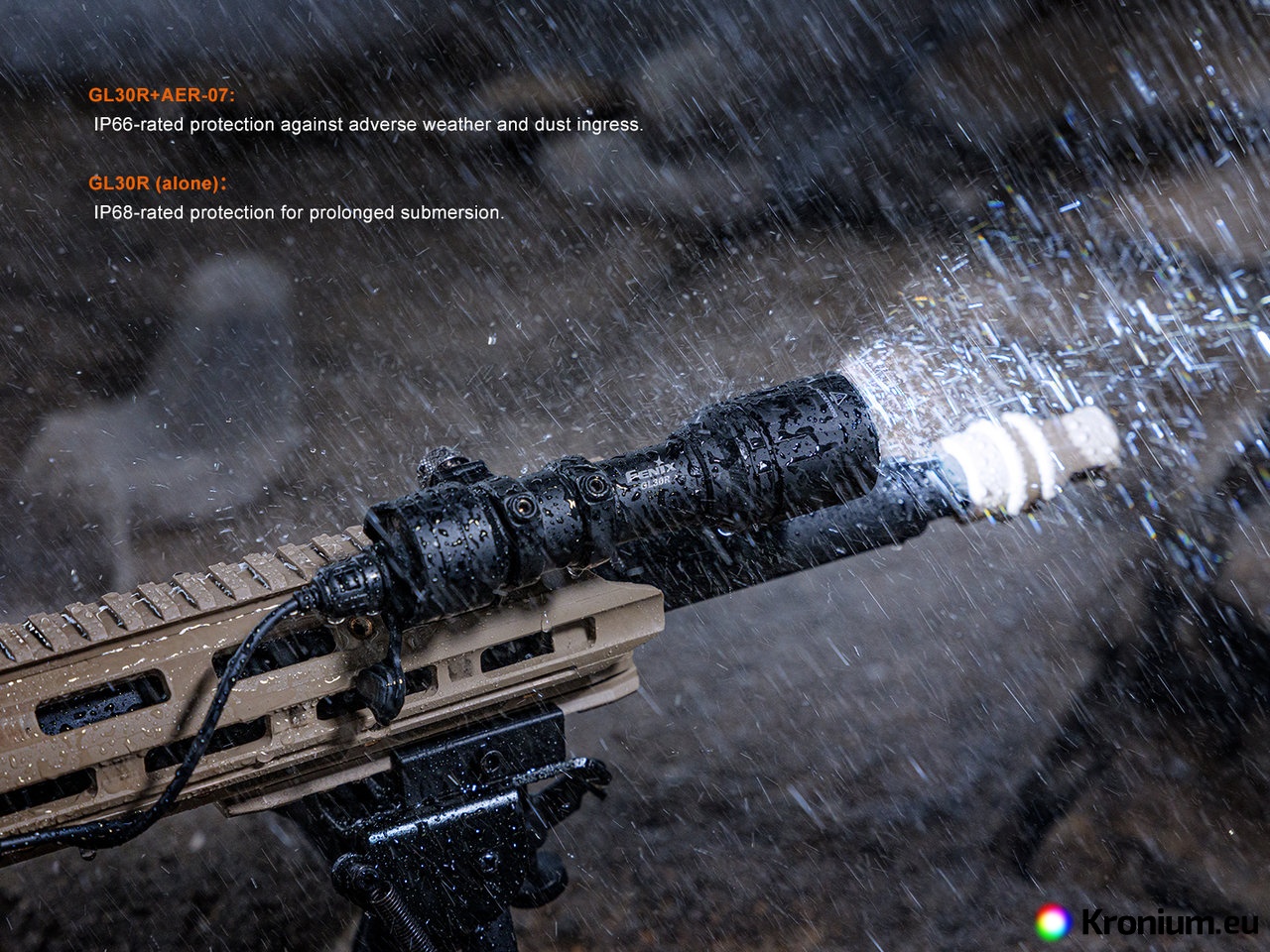 The Fenix GL30R tactical rechargeable LED flashlight is designed specifically for use on long guns. It offers a top lighting performance of 800 ANSI lumens with an extreme beam distance of up to 630 meters. The flashlight is powered by a single 18650 Li-ion battery with a capacity of 3400 mAh, which is recharged directly in the flashlight via a multifunctional USB-C port and is included in the package. Alternatively, two disposable lithium CR123A batteries can be used. The flashlight is controlled by a tactical tail switch or the included AER-07 remote cable switch. The remote switch connects to the USB-C port and features a locking slider to prevent accidental activation. Mounting on a weapon is highly versatile – the flashlight comes with mounts for the standard Picatinny rail (MIL-STD-1913) as well as the M-Lok system, allowing for flexible installation in both direct (in-line) and offset positions. This makes the flashlight a perfect tool for professionals, armed forces, sports shooters, hunters, and airsoft enthusiasts.