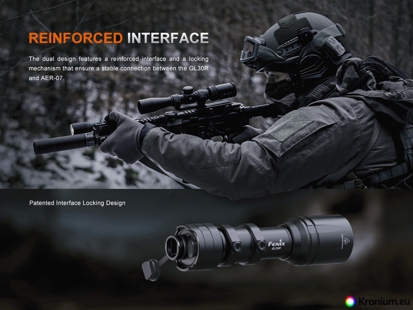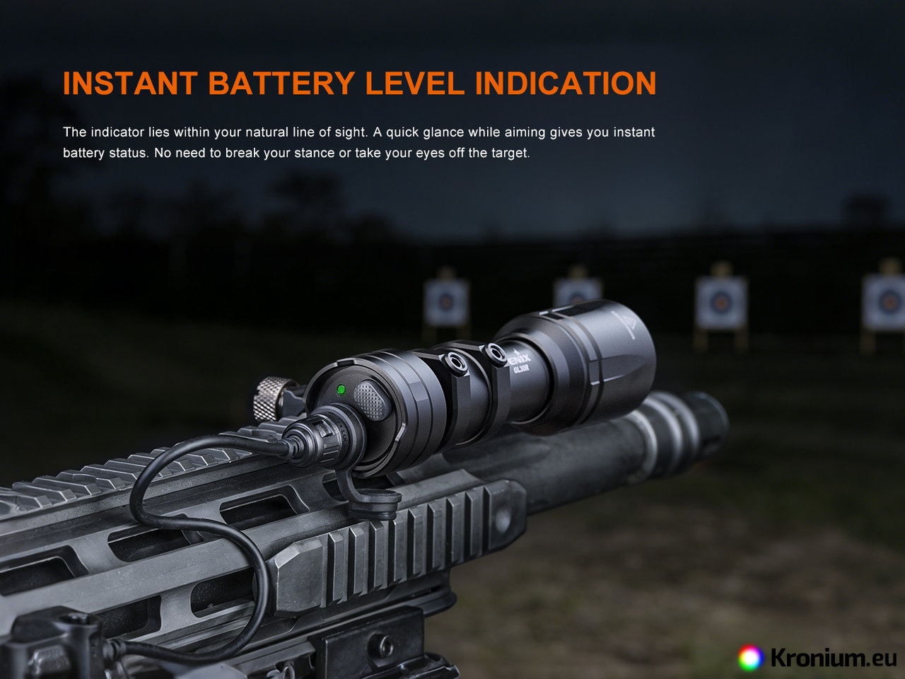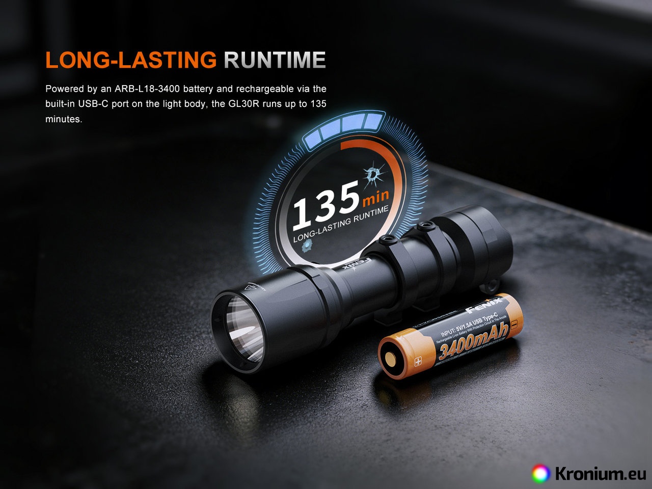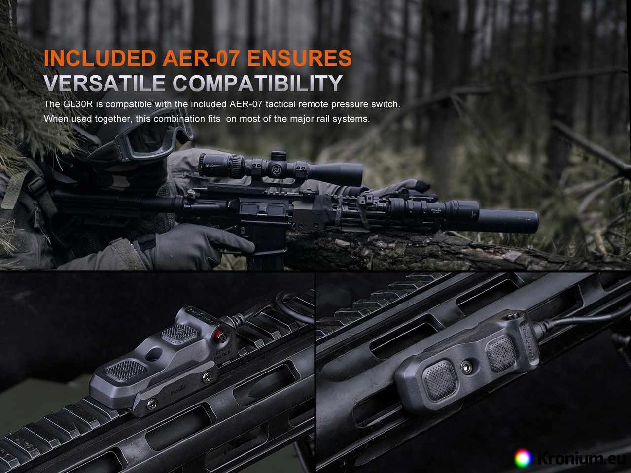 The Fenix GL30R tactical rechargeable LED flashlight is designed specifically for use on long guns. It offers a top lighting performance of 800 ANSI lumens with an extreme beam distance of up to 630 meters. The flashlight is powered by a single 18650 Li-ion battery with a capacity of 3400 mAh, which is recharged directly in the flashlight via a multifunctional USB-C port and is included in the package. Alternatively, two disposable lithium CR123A batteries can be used. The flashlight is controlled by a tactical tail switch or the included AER-07 remote cable switch. The remote switch connects to the USB-C port and features a locking slider to prevent accidental activation. Mounting on a weapon is highly versatile – the flashlight comes with mounts for the standard Picatinny rail (MIL-STD-1913) as well as the M-Lok system, allowing for flexible installation in both direct (in-line) and offset positions. This makes the flashlight a perfect tool for professionals, armed forces, sports shooters, hunters, and airsoft enthusiasts.