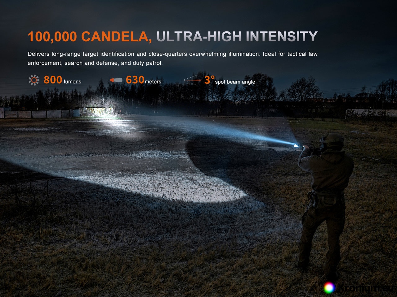 - The optics create a tightly focused light beam with a distance of 630 meters (100,000 cd).