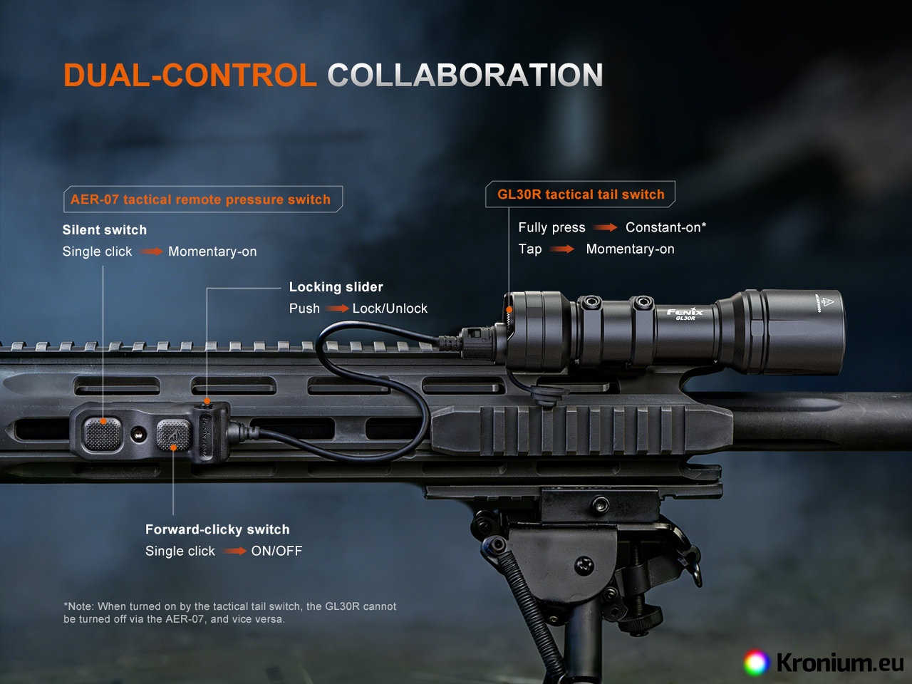 The flashlight can be operated either by its tactical tail switch on the body or the included AER-07 remote pressure switch. Note: If you turn the flashlight on with one switch, it cannot be turned off with the other.