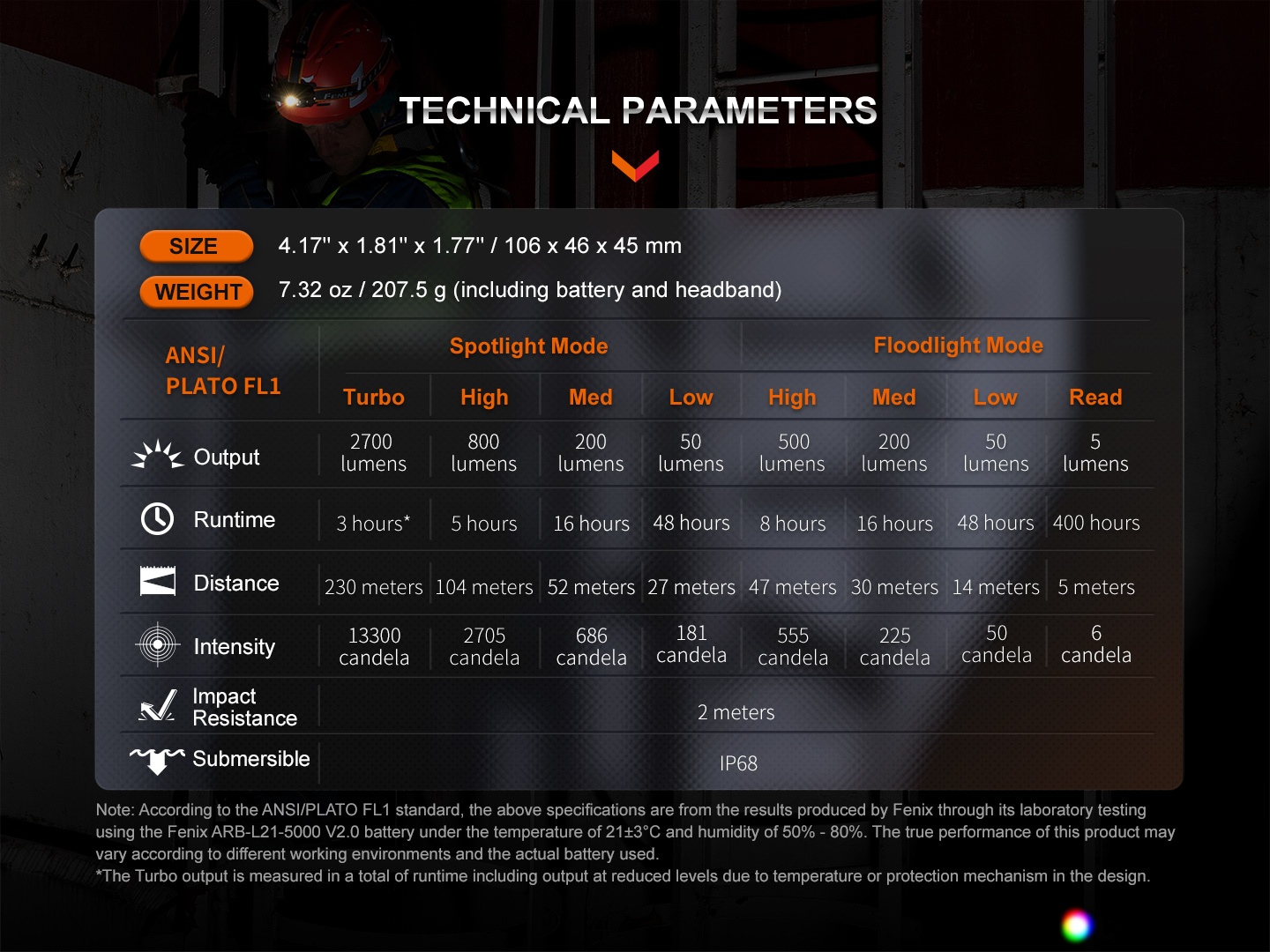 All parameters of the flashlight (luminous flux, battery operation time, waterproofing, afterglow and impact resistance) are measured in compliance with the ANSI/ NEMA FL 1-2009.