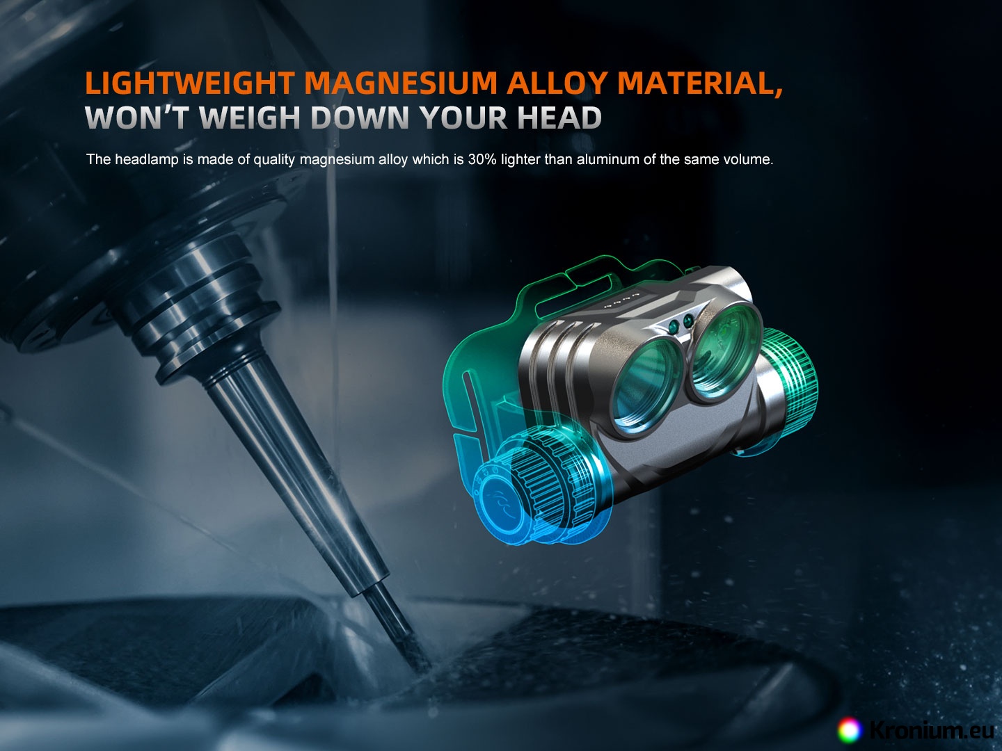 The headlamp is powered by a rechargeable Li-ion 18650 4000 mAh battery, and can also be purchased with a removable rear battery case with a 21700 5000 mAh battery to significantly extend the lighting duration. The headlamp can also be operated without the battery inside, with only power from the powerbank via USB-C cable (with slightly reduced maximum power). The headlamp is made of lightweight and durable magnesium alloy, its construction is fully dustproof and waterproof according to IP68 standard and also shockproof against falls from a height of 2 meters.