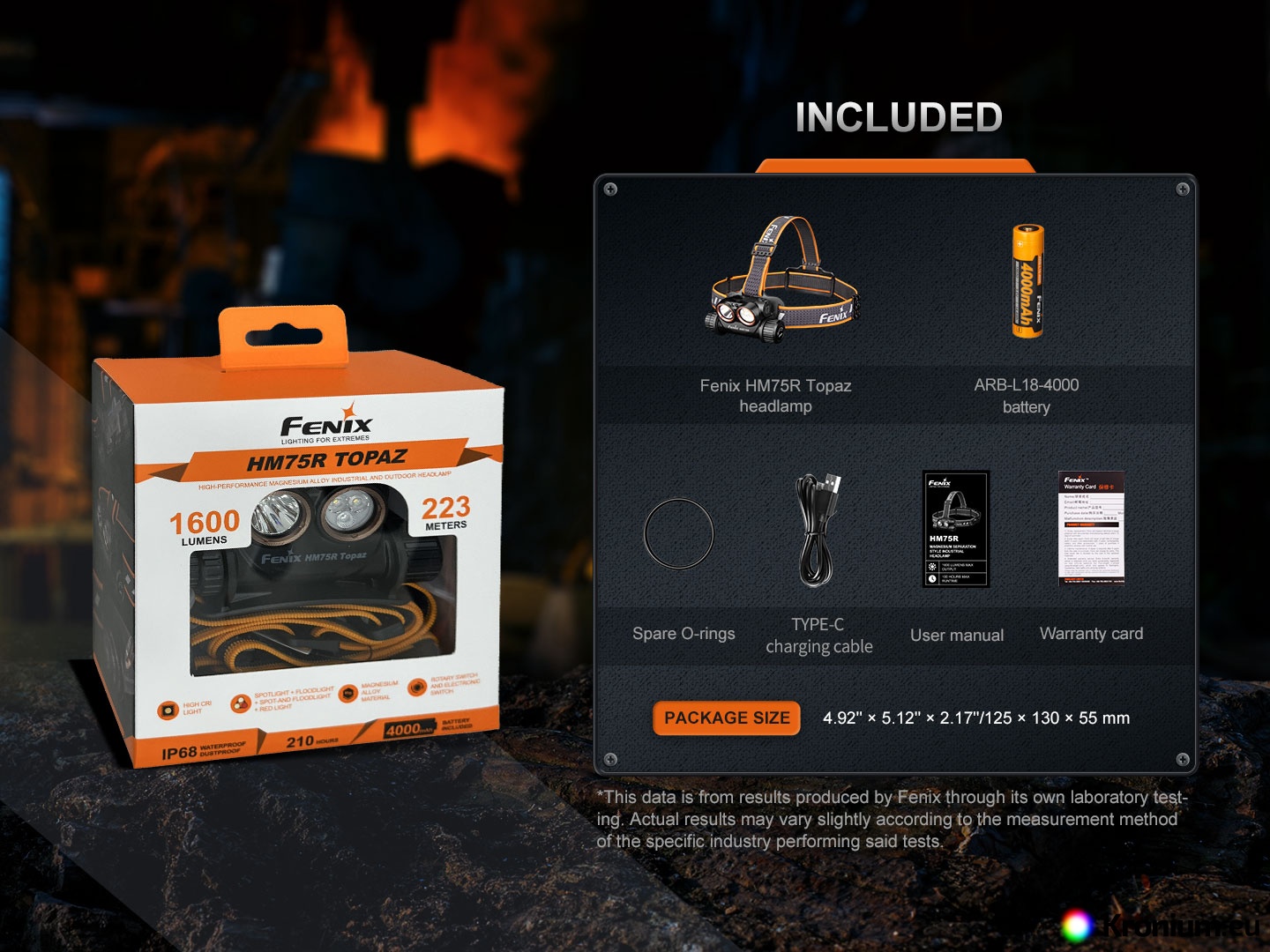 - The headlamp can be purchased with a Fenix APB-30 case, 1.5m USB-C extension cable, external battery for HM75R, set of black straps AFH-02 without reflective elements, USB adapters for mains or car, main strap, top strap.
