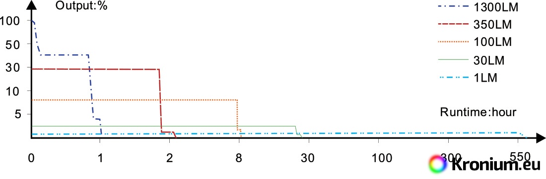- Seven lighting modes: Turbo 1300 lumens (1 h 2 min) – 350 lumens (2 h 13 min) – 100 lumens (8 h 35 min) – 30 lumens (27 h 7 min) - 1 lumen (556 hours) – Strobe (1300 lumens) – SOS (30 lumens).