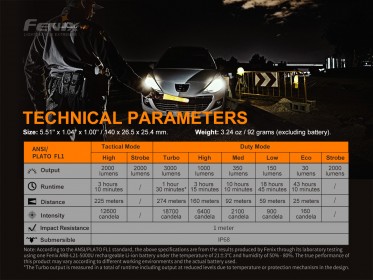 All flashlight parameters (lumen output, battery life, waterproof, range and shock resistance) are measured in accordance with ANSI/NEMA FL 1-2009.