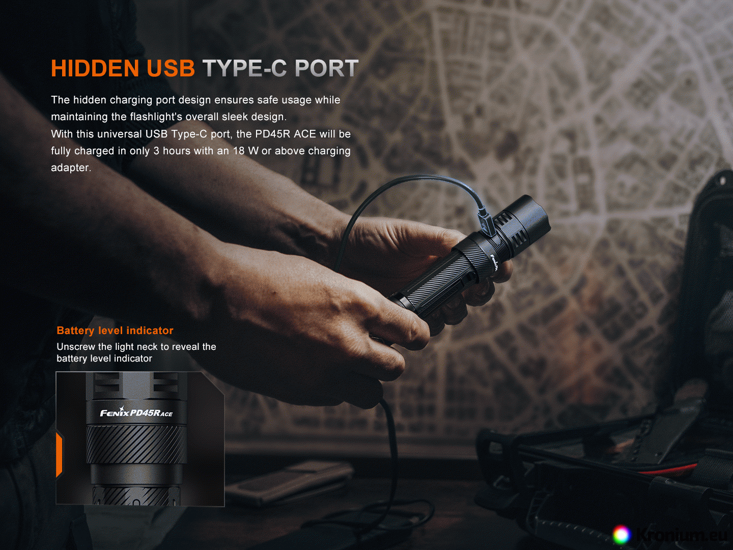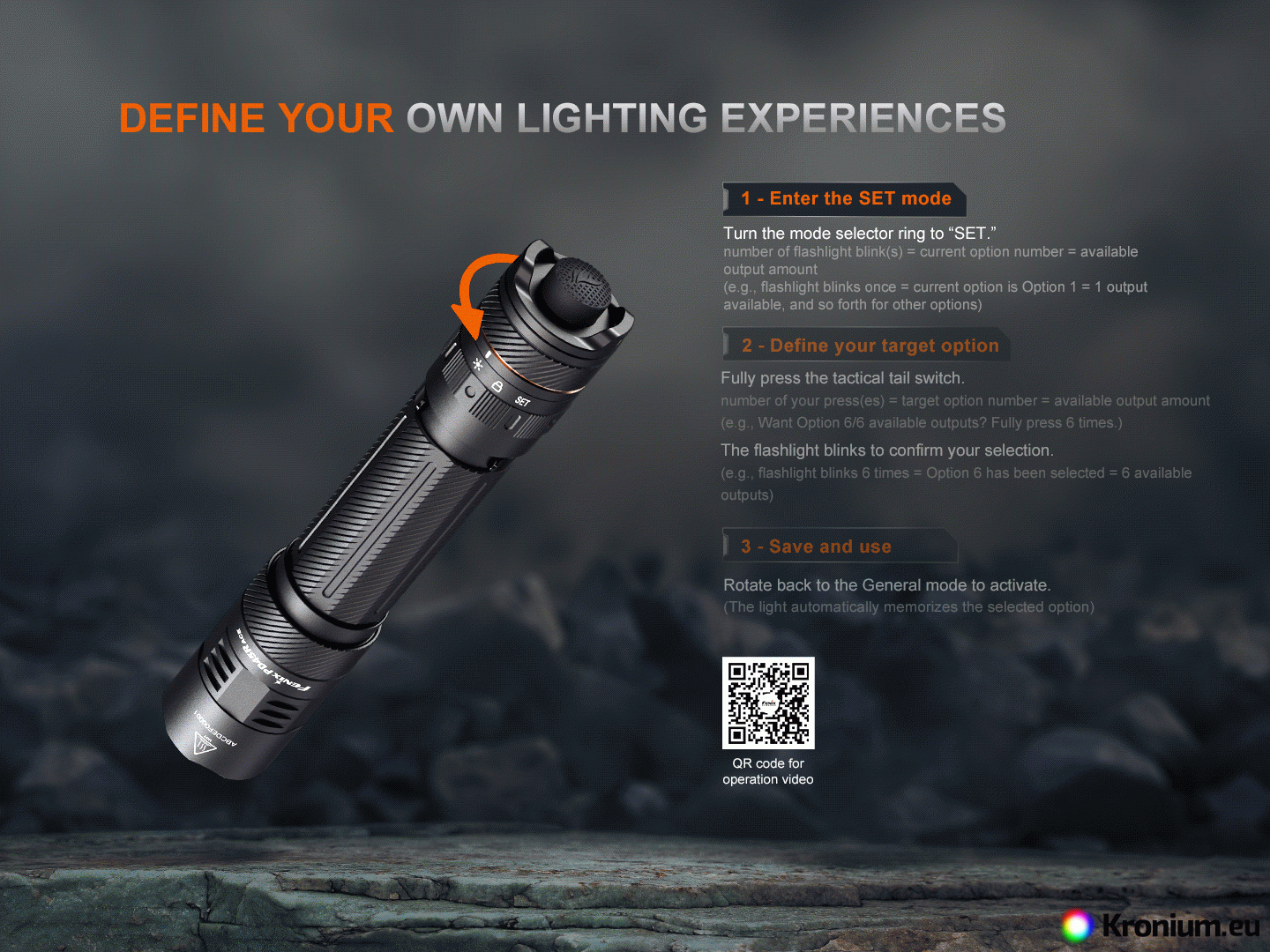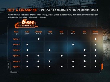 The Fenix PD45R ACE rechargeable tactical flashlight offers a peak light output of up to 3200 lumens (ANSI) and a range of up to 410 meters. Its revolutionary feature is the ability to program your own set of modes to suit your exact needs – from a simple Turbo + Stroboscope combination to a full range of seven functions. No more clicking through unnecessary modes at the critical moment, set up only the functions you will actually use.