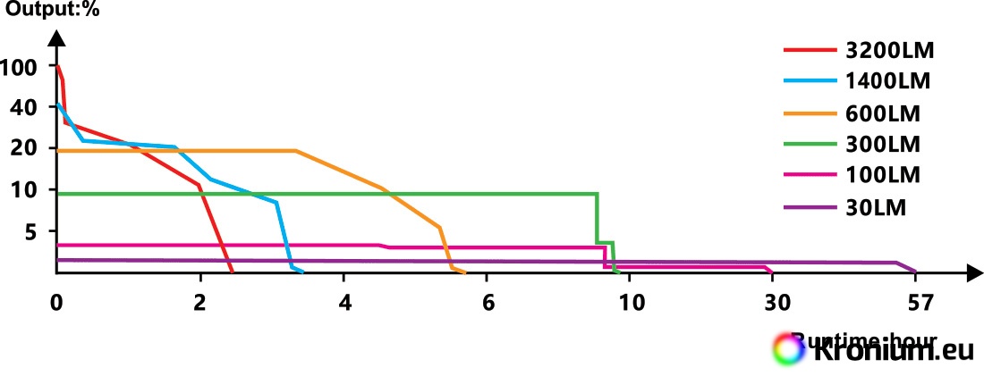 | Output | 3200 lm | 1400 lm | 600 lm | 300 lm | 100 lm | 30 lm | 3200 lm |