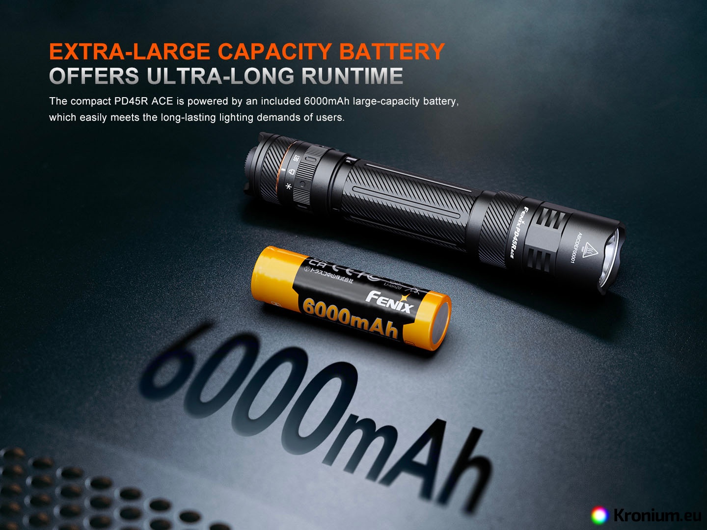 - The flashlight comes with a Fenix ARB-L21-6000 battery pack, USB-C charging cable, wrist lanyard, belt pouch and spare o-rings.