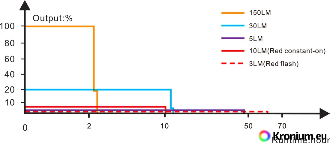 - Three white light modes: 150 lumens (2.5 hours)-> 30 lumens (12.3 hours)-> 5 lumens (49 hours).