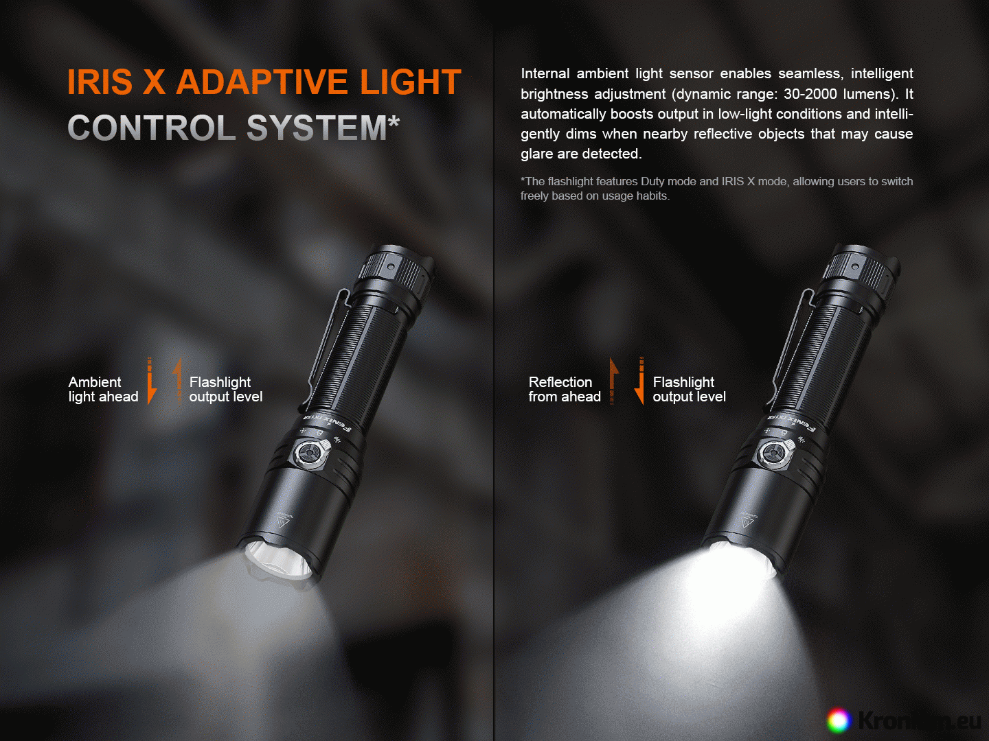 Flash mode: Strobe 2500 lumens. - In IRIS X mode, the flashlight automatically adjusts brightness based on ambient light conditions, preventing blinding from reflections.