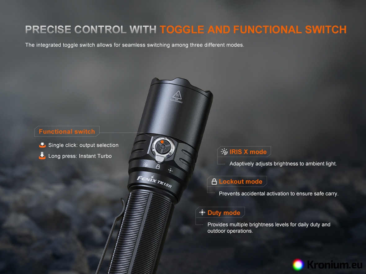 Fenix TK15R with a maximum output of up to 3200 lumens brings the unique smart IRIS X sensor as one of the few handheld flashlights in the world. This innovative technology automatically adjusts the flashlight's output based on ambient light and the distance of the illuminated object. What does this mean in practice? When using the IRIS X mode, you won't be blinded by annoying reflections from a nearby wall, obstacle, or when reading a map – the flashlight instantly and automatically reduces brightness. But as soon as you aim into an open dark space, it immediately unleashes extreme power up to 2000 lumens. Thanks to the top-tier Luminus SFT70 LED, it can shine up to an impressive distance of 490 meters. For perfect control in crisis situations, there is a tactical tail switch complemented by an intuitive side rotary switch. This allows seamless switching between standard Duty mode, smart IRIS X mode, and flashlight lockout.