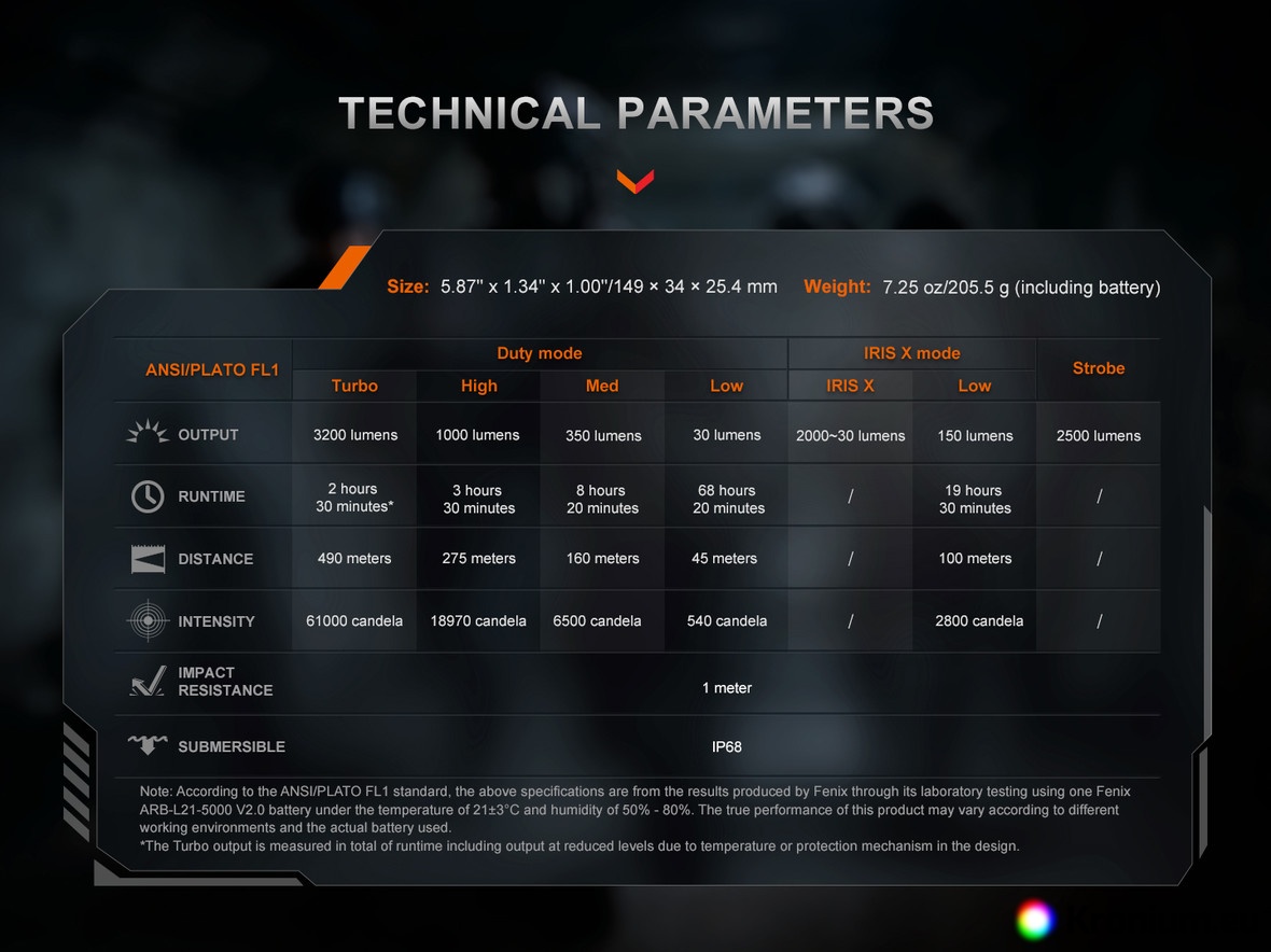 All flashlight parameters (luminous flux, battery life, waterproofness, beam distance, and impact resistance) are measured in accordance with the ANSI/NEMA FL 1-2009 standard.