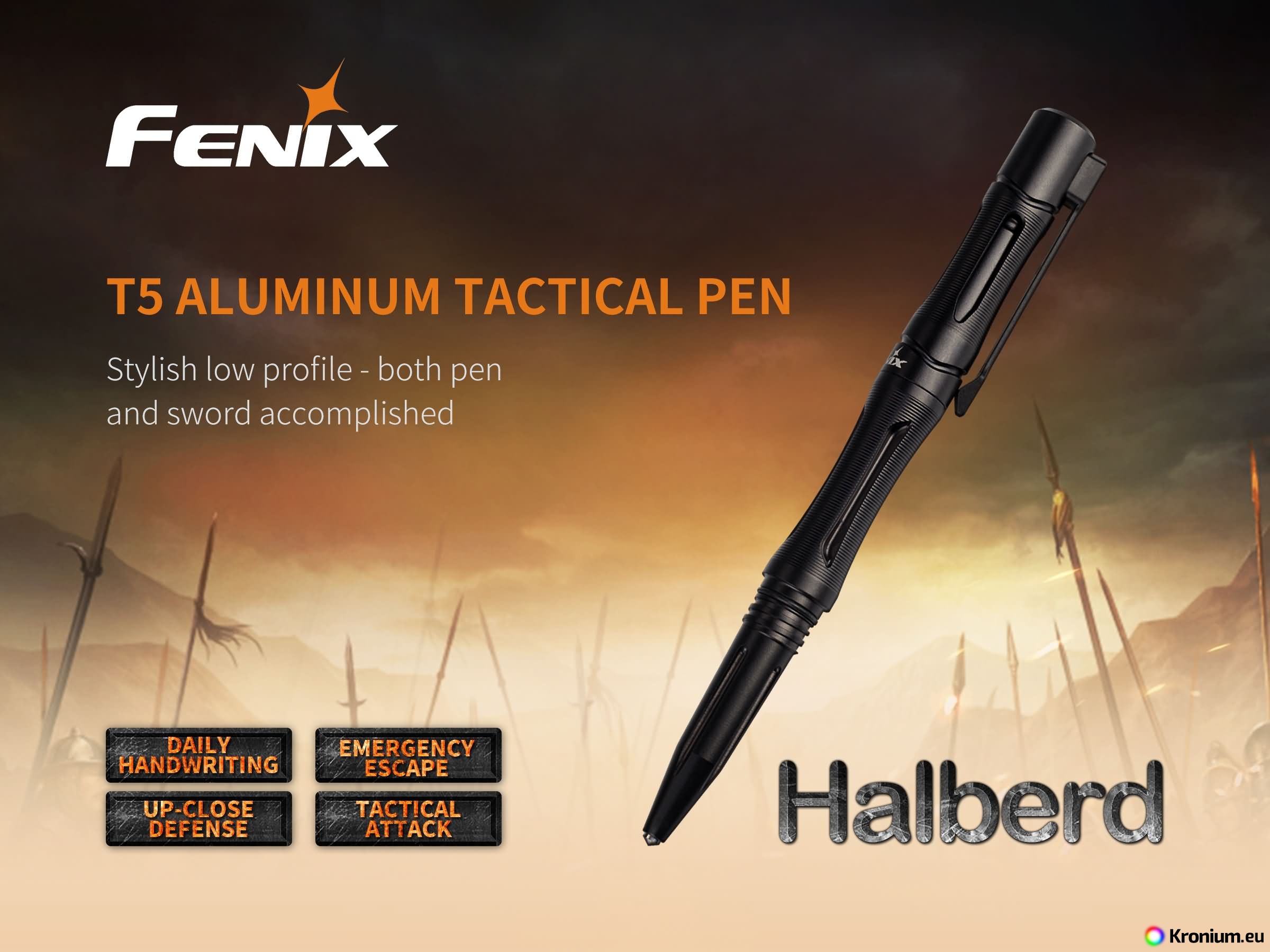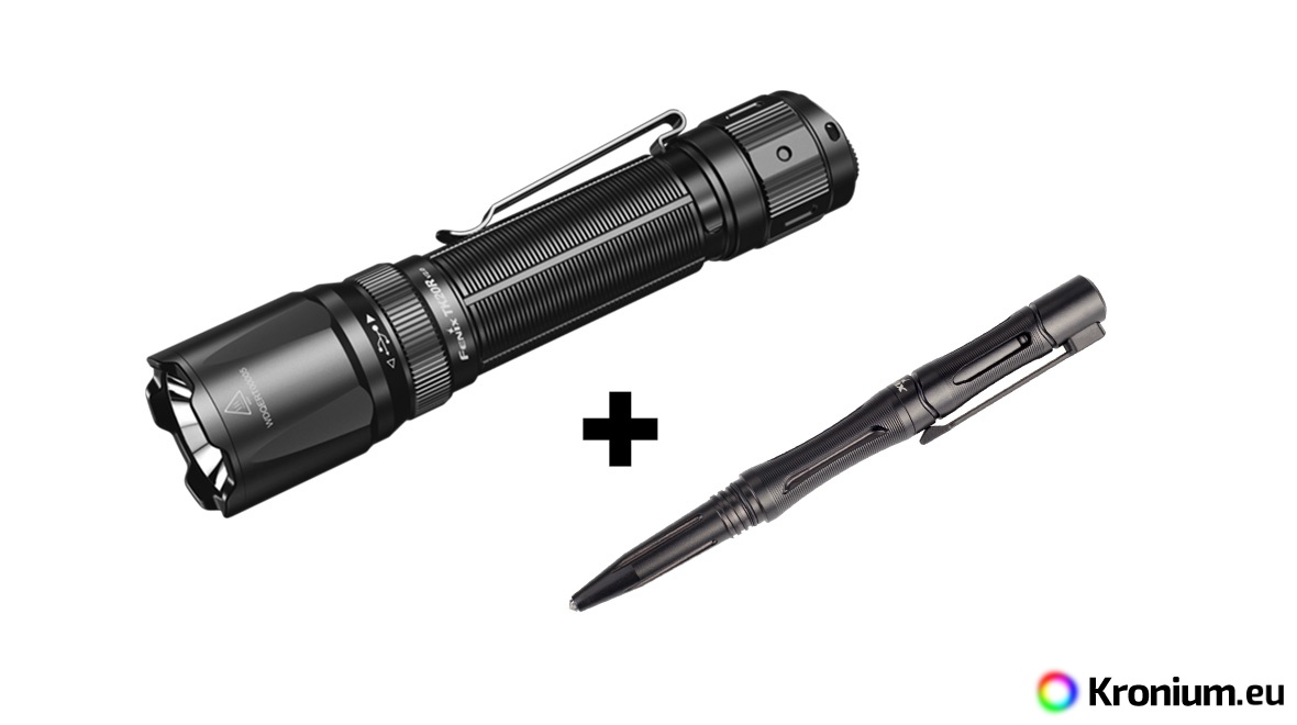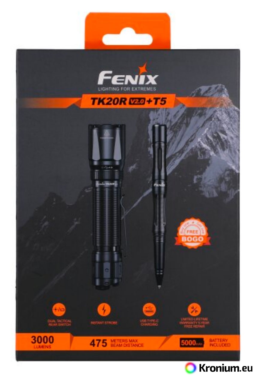 Discounted set of the Fenix TK20R V2.0 tactical flashlight and the T5 tactical pen in black.
