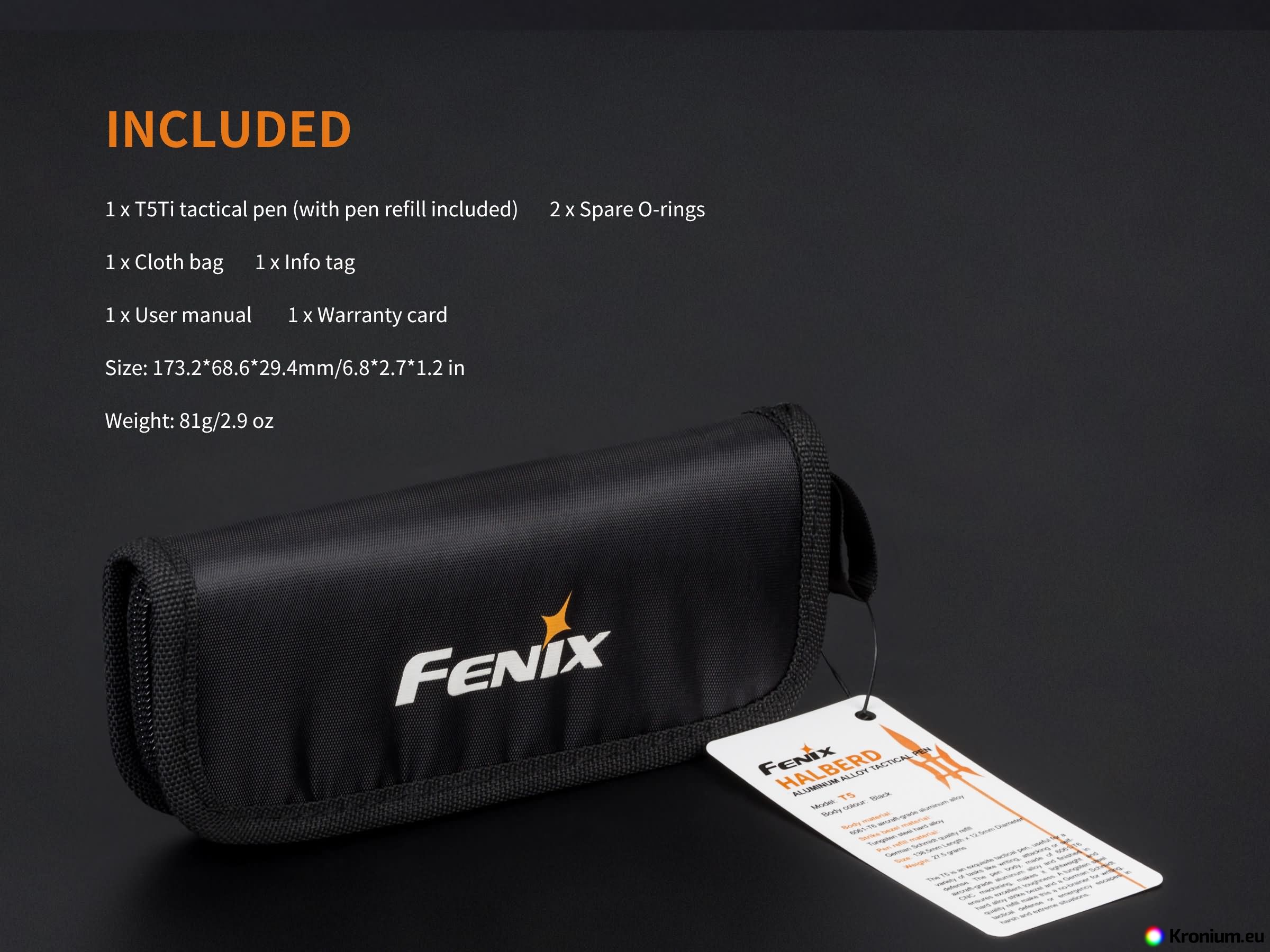 - The flashlight comes with a T5 tactical pen, wrist lanyard, belt holster, spare o-ring, USB charging cable, and a Fenix Li-ion 21700 5000 mAh battery.