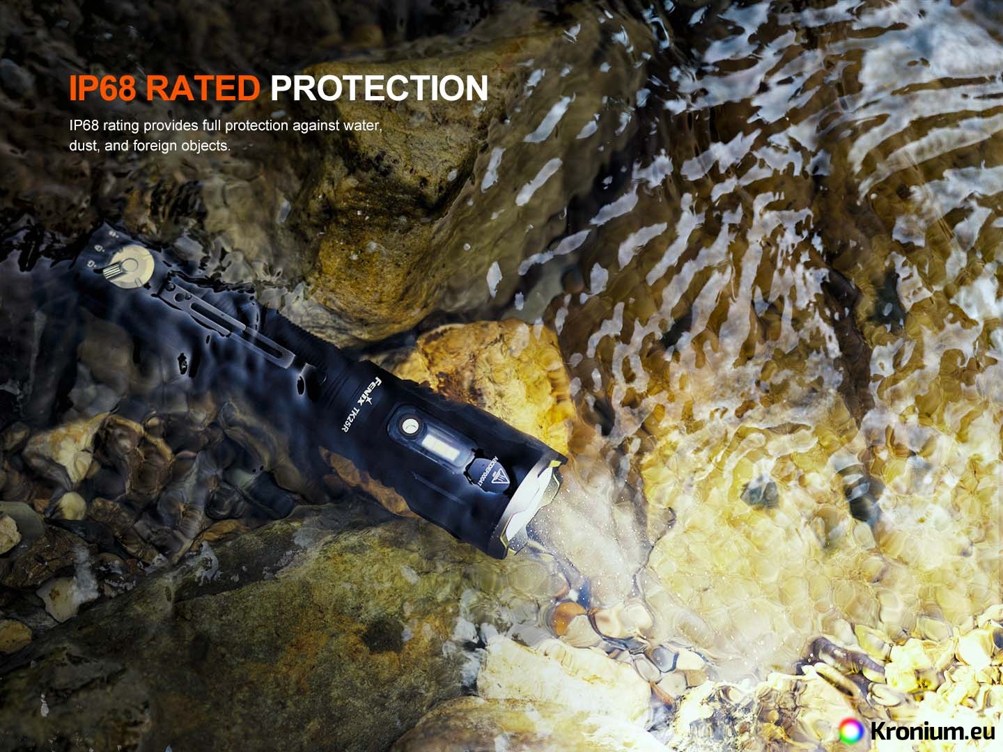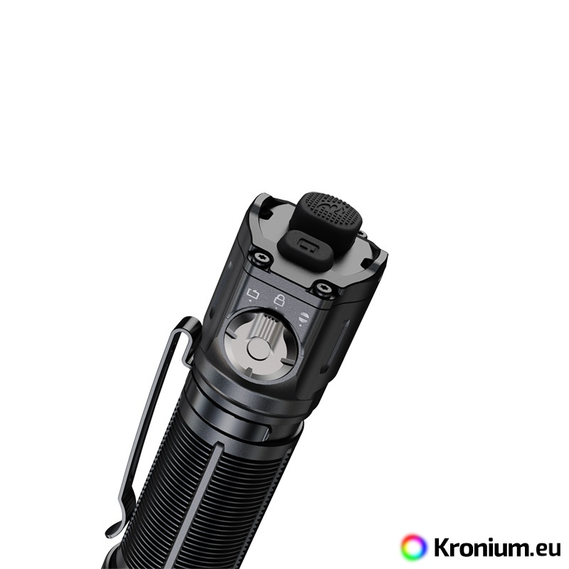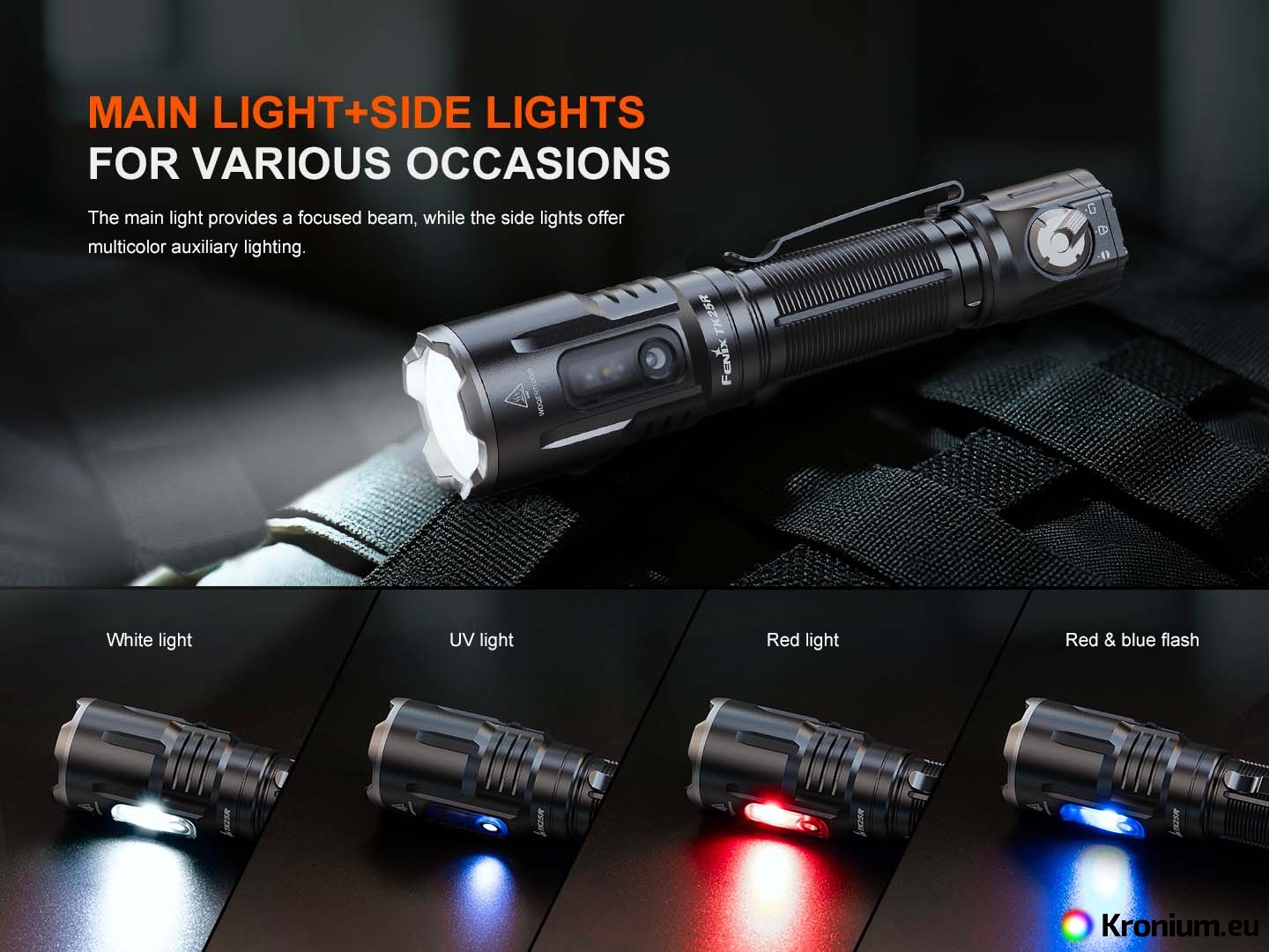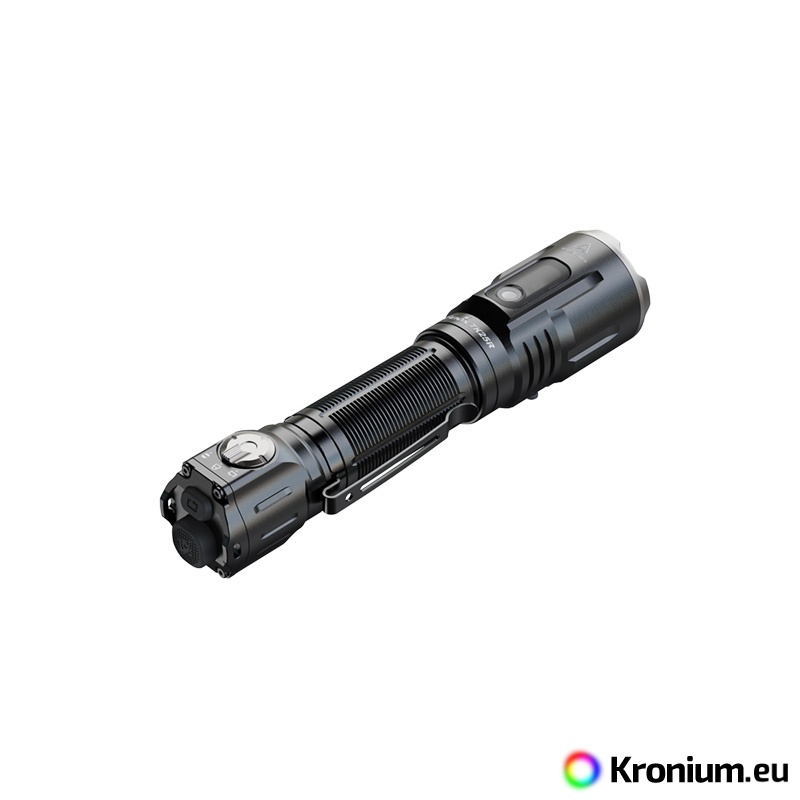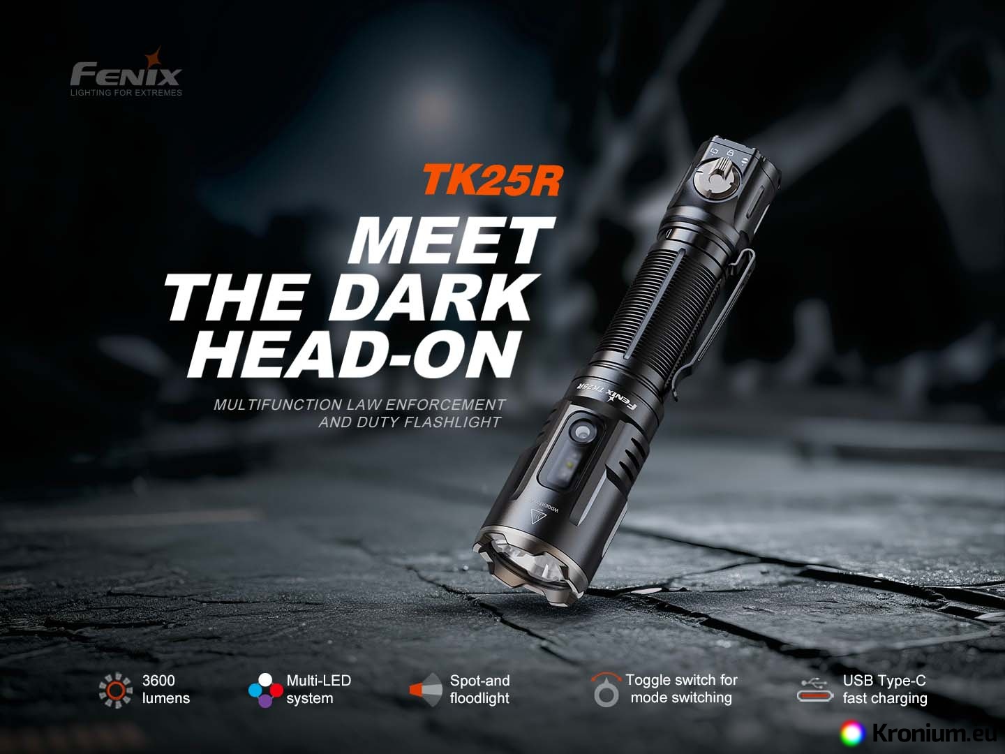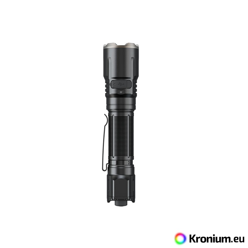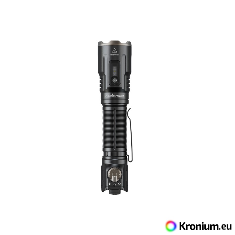 The Fenix TK25R is a top-class tactical flashlight that offers high performance and versatile use thanks to the combination of a main and side reflector. The main reflector with a premium Cree XHP50.3 LED provides a luminous flux of up to 3600 lumens with a beam distance of 350 meters. A unique feature of this model is the integrated side light, which features diffused white, red, and ultraviolet light (365 nm) with a power of up to 700 mW, allowing for quick authentication of documents and banknotes, curing adhesives, or checking for liquid leaks. Furthermore, the side light is equipped with a red-blue flashing function, which will be especially appreciated by armed forces. Power is provided by a Li-ion battery type 21700 (Fenix ARB-L21-5000 V2.0) with a capacity of 5000 mAh, charged via a modern USB-C connector directly on the flashlight body. The body is made of durable A6061-T6 aluminum alloy with hard anodization and is fully waterproof and dustproof according to the IP68 standard.