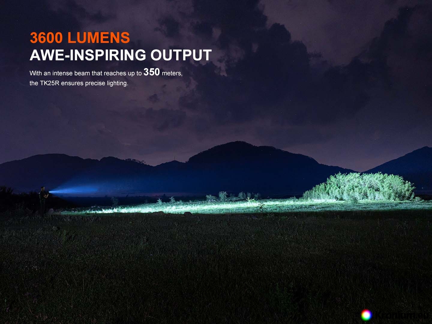 - Five white light power modes: 3600 lumens (2 h 20 min) – 1000 lumens (3 h) – 350 lumens (7 hours) – 30 lumens (55 hours) – Strobe (3600 lumens).