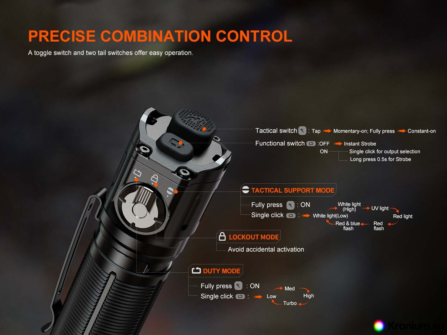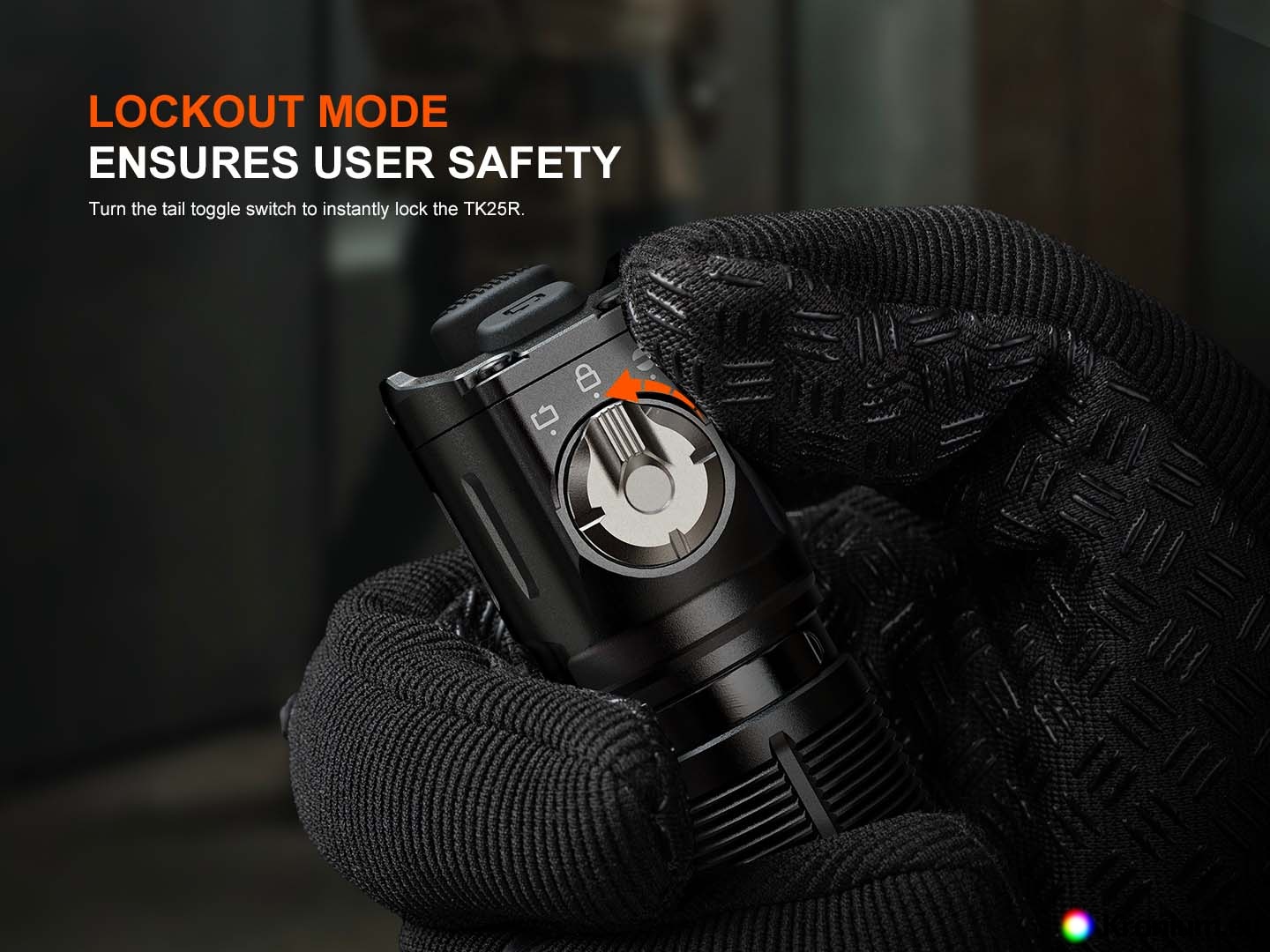The Fenix TK25R offers a total of five main reflector modes including a blinding strobe and six side light modes (including red light for preserving night vision). Control is provided by a tactical dual tail switch, which allows for momentary on, quick activation of turbo mode, and instant strobe activation. This ergonomics is ideal for crisis situations where light needs to be used quickly and without fumbling for buttons.