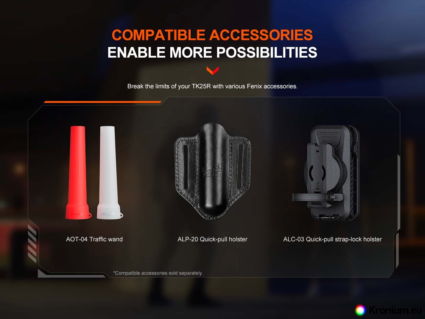 - Optional original accessories include AOT-04 traffic wand, ALP-20 leather holster, ALC-03 flashlight holder, Fenix ALD-05 helmet mount, Fenix bike mount, USB mains adapter and USB car adapter.