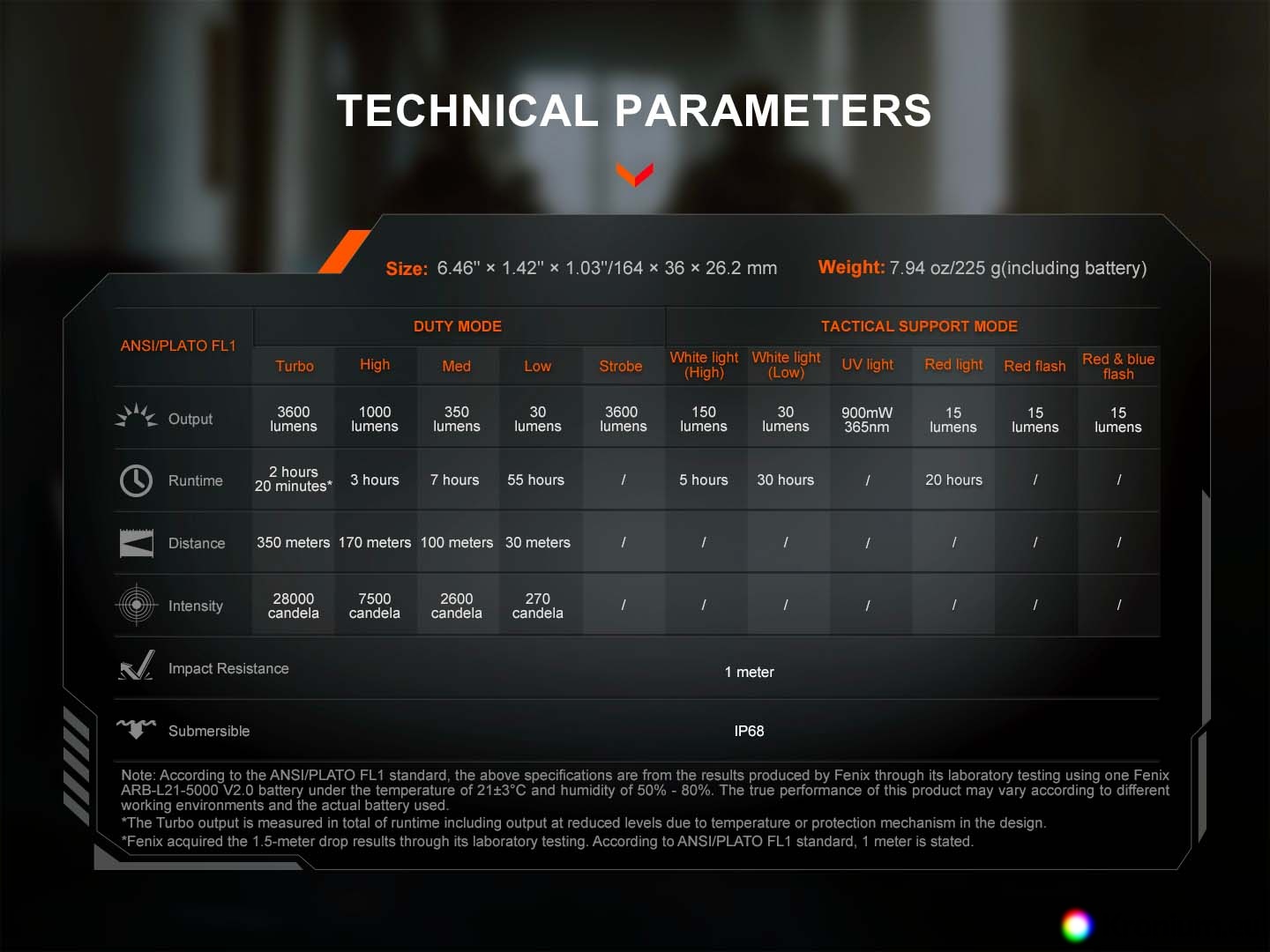 All flashlight parameters (luminous flux, battery life, waterproofing, beam distance, and impact resistance) are measured in accordance with the ANSI/NEMA FL 1-2009 standard.