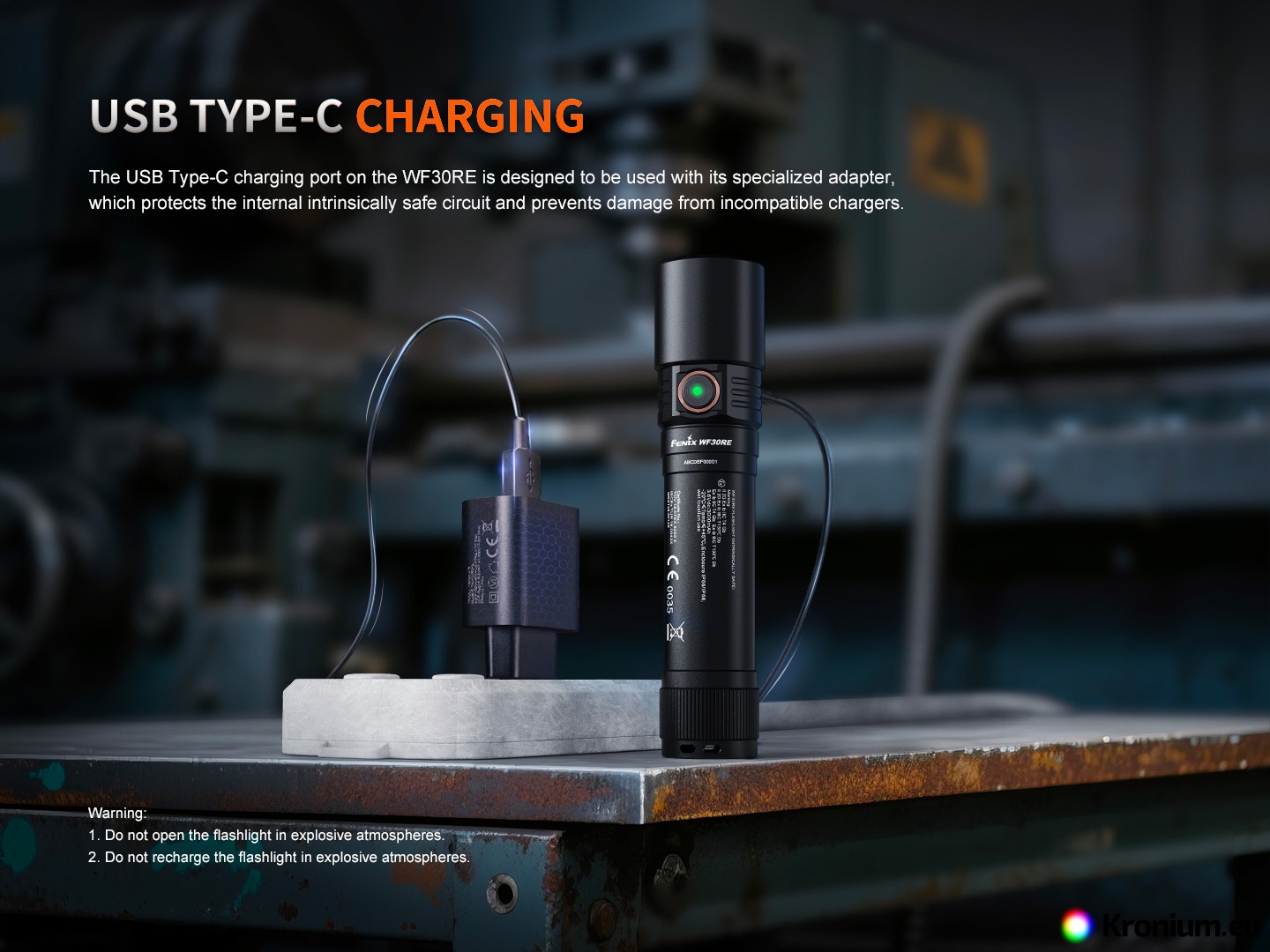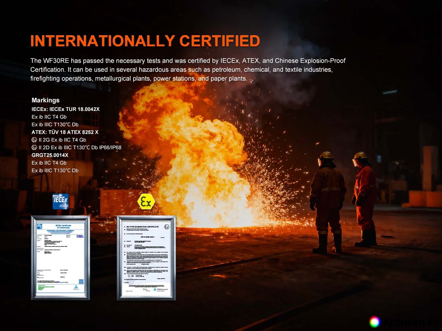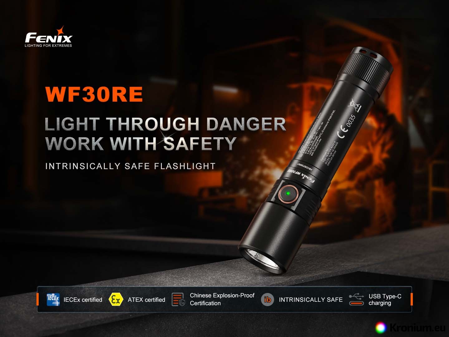 The professional rechargeable flashlight Fenix WF30RE is ATEX/IECex certified for use in explosive atmospheres. The flashlight is powered by a specially modified ARB-L21-3000Ex Li-ion battery with a capacity of 3000 mAh and provides a light output of up to 300 lumens with a beam distance of 149 meters. The battery is charged directly in the flashlight via a USB-C connector. The body of the flashlight is made of aircraft-grade aluminum, ensuring high durability and impact resistance. The flashlight is designed especially for firefighters and rescue workers, and it is also suitable as a work light in industrial facilities where explosive dusts and gases may be present. This includes, for example, chemical plants, refineries, textile mills, paper mills, flour mills, metallurgical plants, power stations, and other facilities.