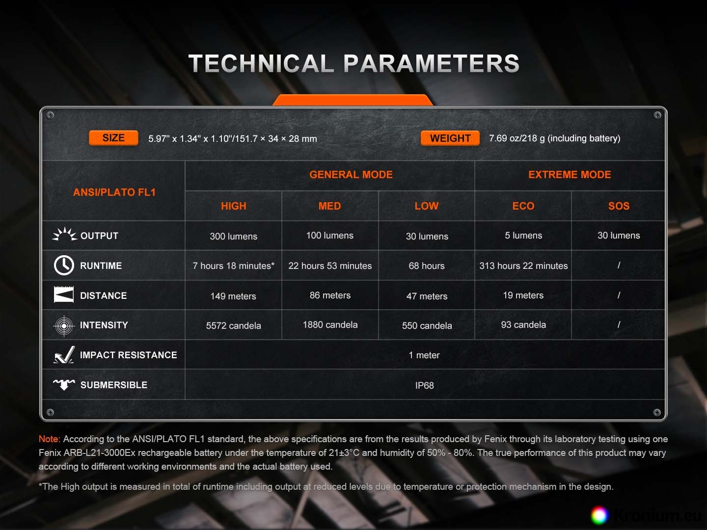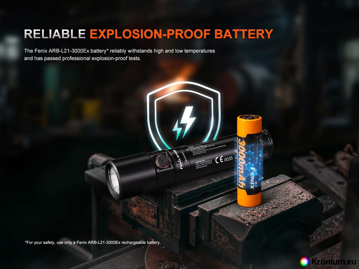 - It uses a special Fenix ARB-L21-3000Ex Li-ion battery with a 3000 mAh capacity. It is a modified type certified for explosive atmospheres.