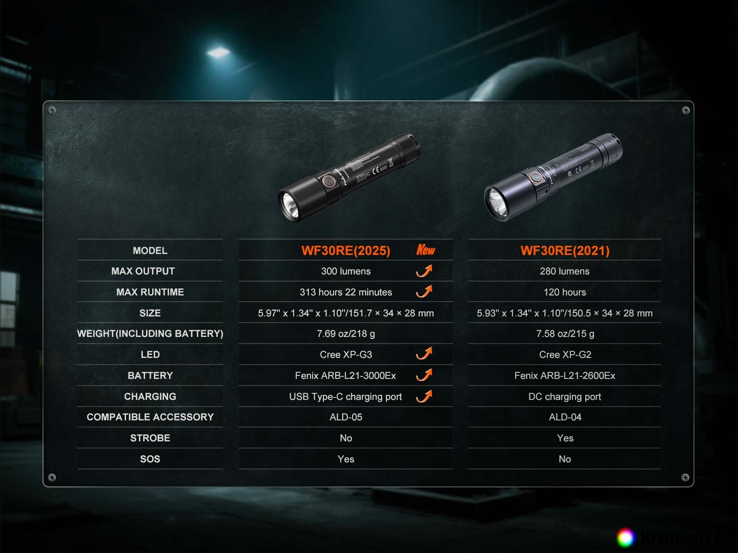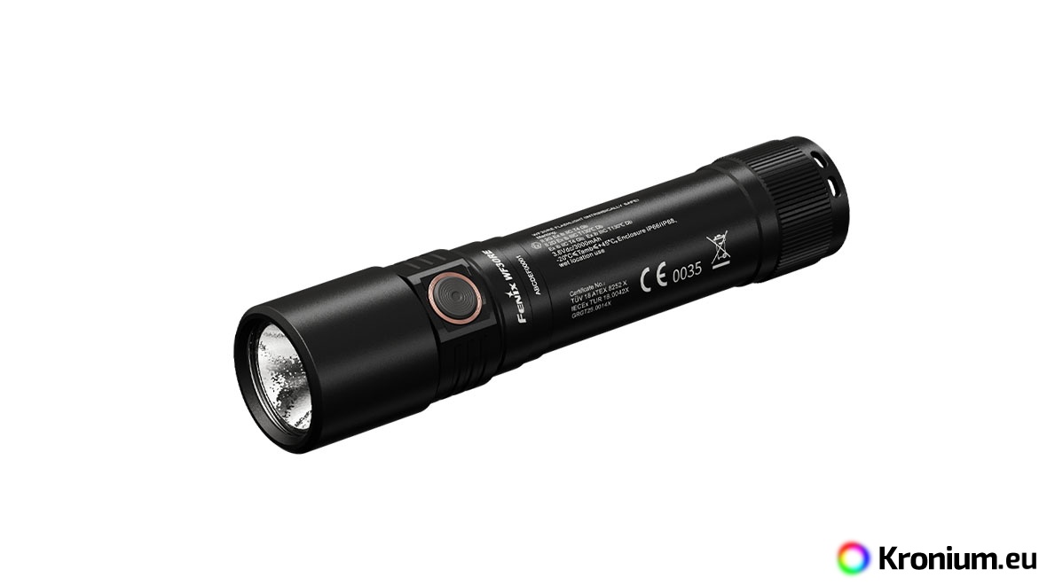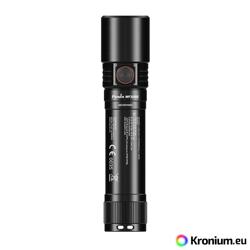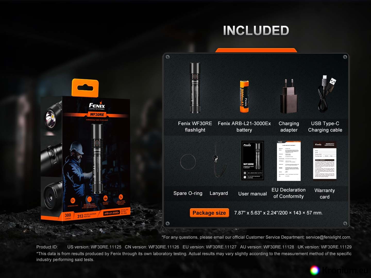 - Package contents: Fenix WF30RE flashlight, Fenix ARB-L21-3000Ex battery, charging USB adapter, USB-C charging cable, EU Declaration of Conformity, spare O-ring, lanyard, user manual, warranty card.