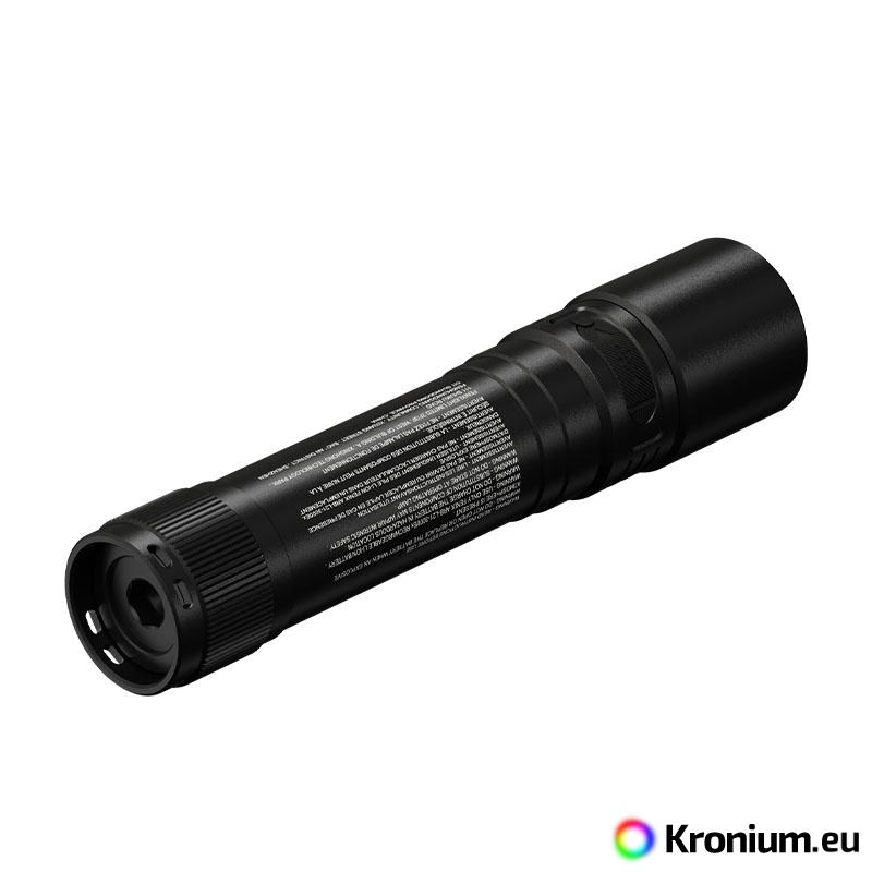 - The battery is charged directly in the flashlight via a modern USB-C connector.