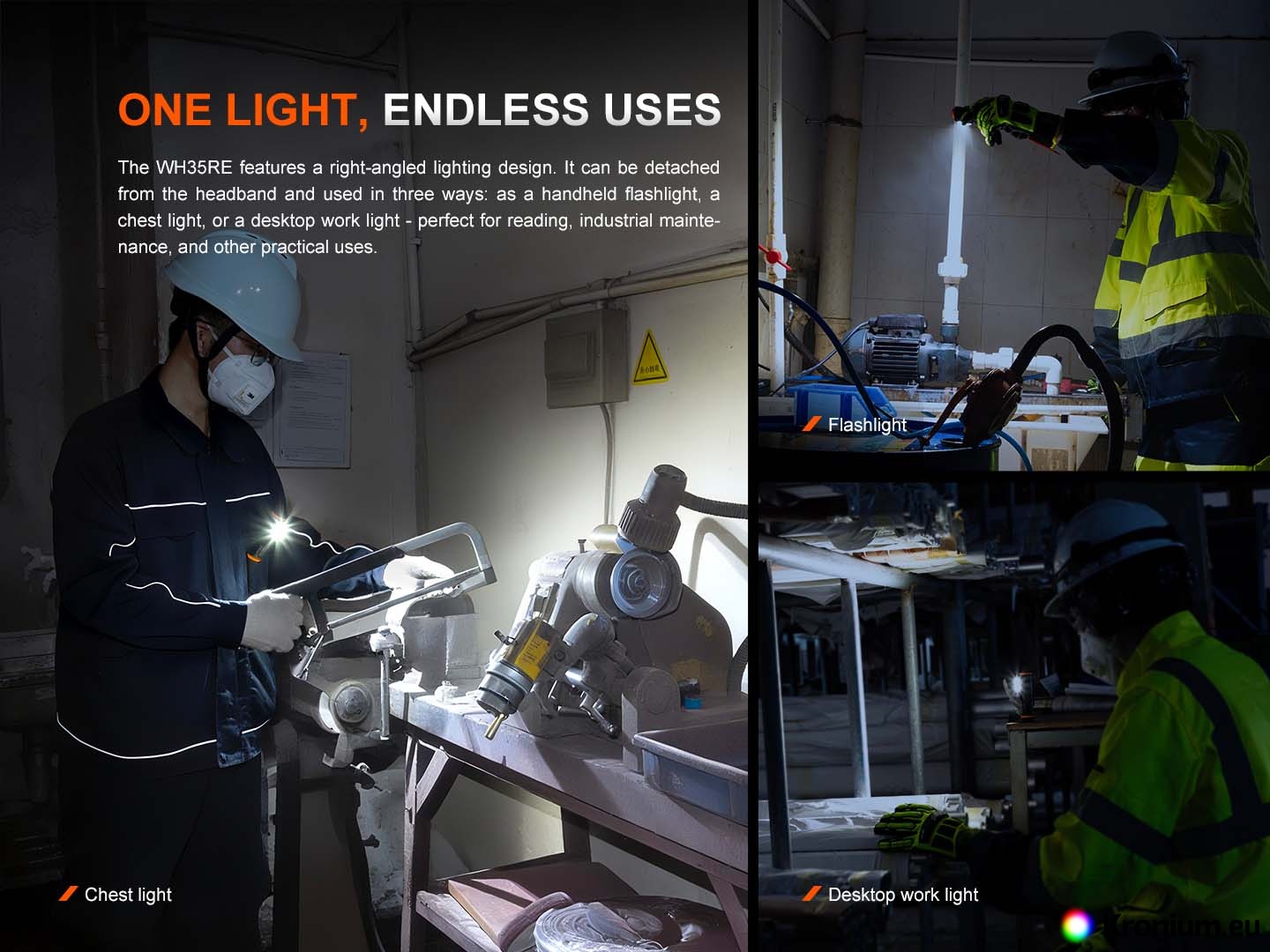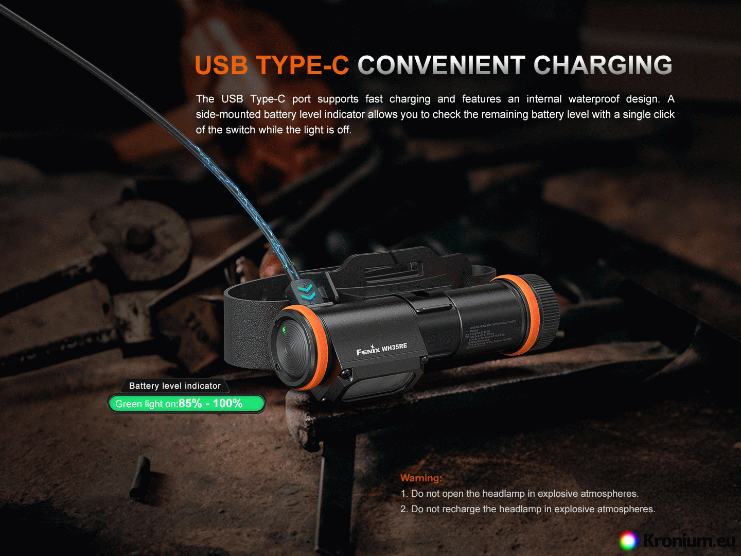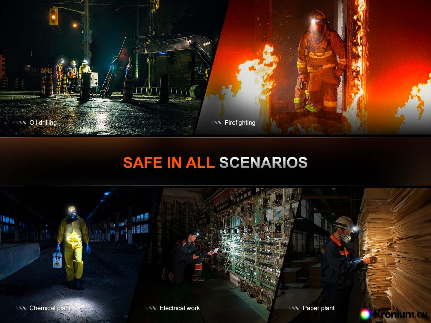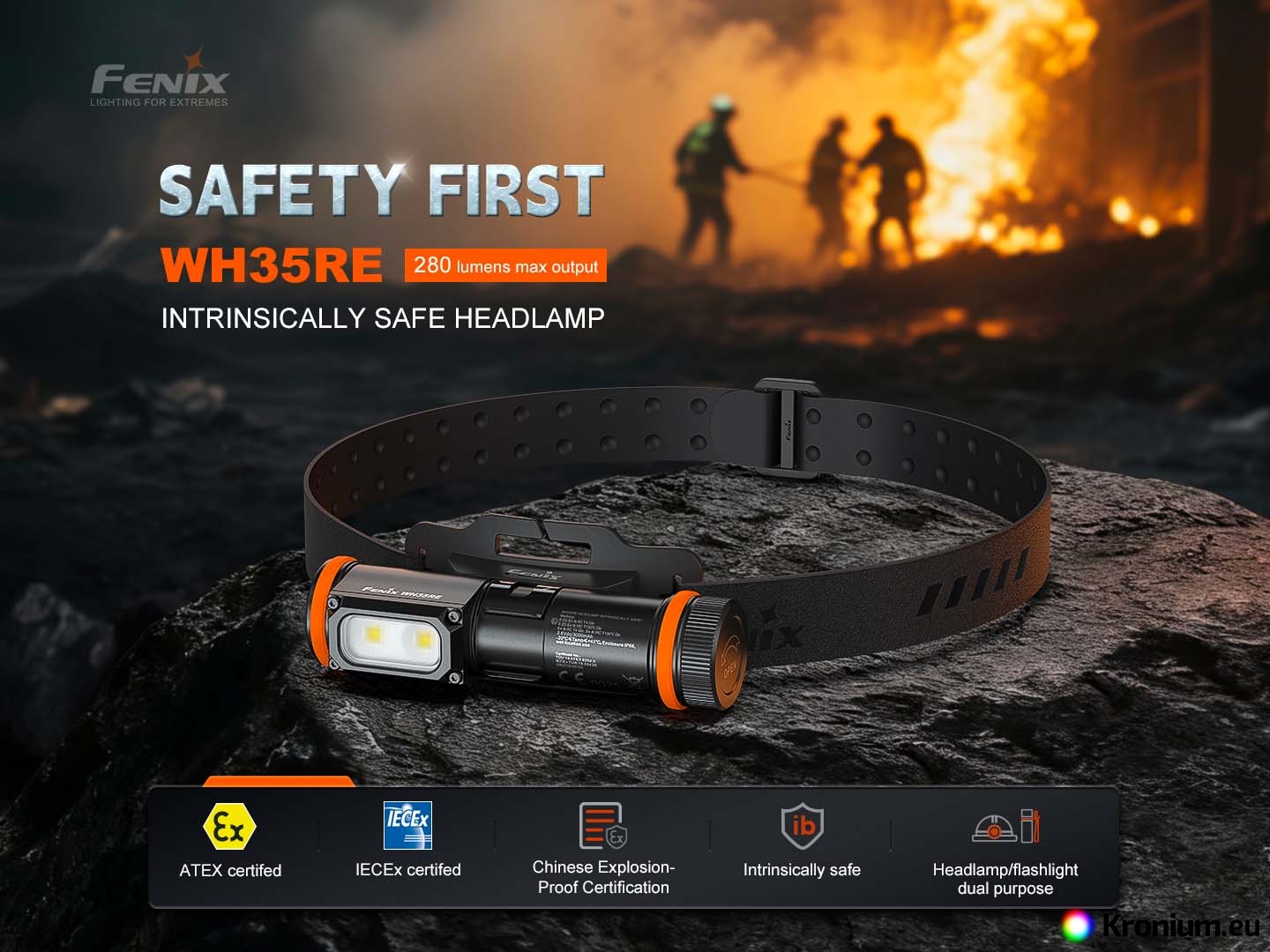 The Fenix WH35RE is a safe work headlamp for explosive environments, designed for various areas with explosion risk, excluding underground mines. It is equipped with ATEX/IECex certification. It offers a maximum output of 280 lumens and is powered by a specially modified ARB-L21-3000Ex Li-ion battery with a capacity of 3000 mAh (included in the package), which is recharged directly in the flashlight via a modern USB-C connector. The practicality of the headlamp is enhanced by the ability to remove the light from the head mount and use it as a handheld or work flashlight. Additionally, the headlamp is equipped with a detachable steel clip, so you can easily attach it to a pocket or strap. Its large switch allows for simple and precise operation – even with gloves on.