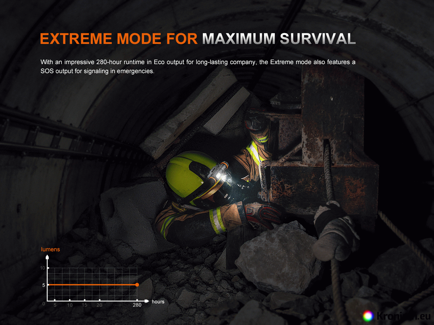 - Five white light modes: 280 lumens (6 hours) -> 100 lumens (14 hours) -> 30 lumens (64 hours) -> 5 lumens (280 hours) -> SOS 30 lumens.