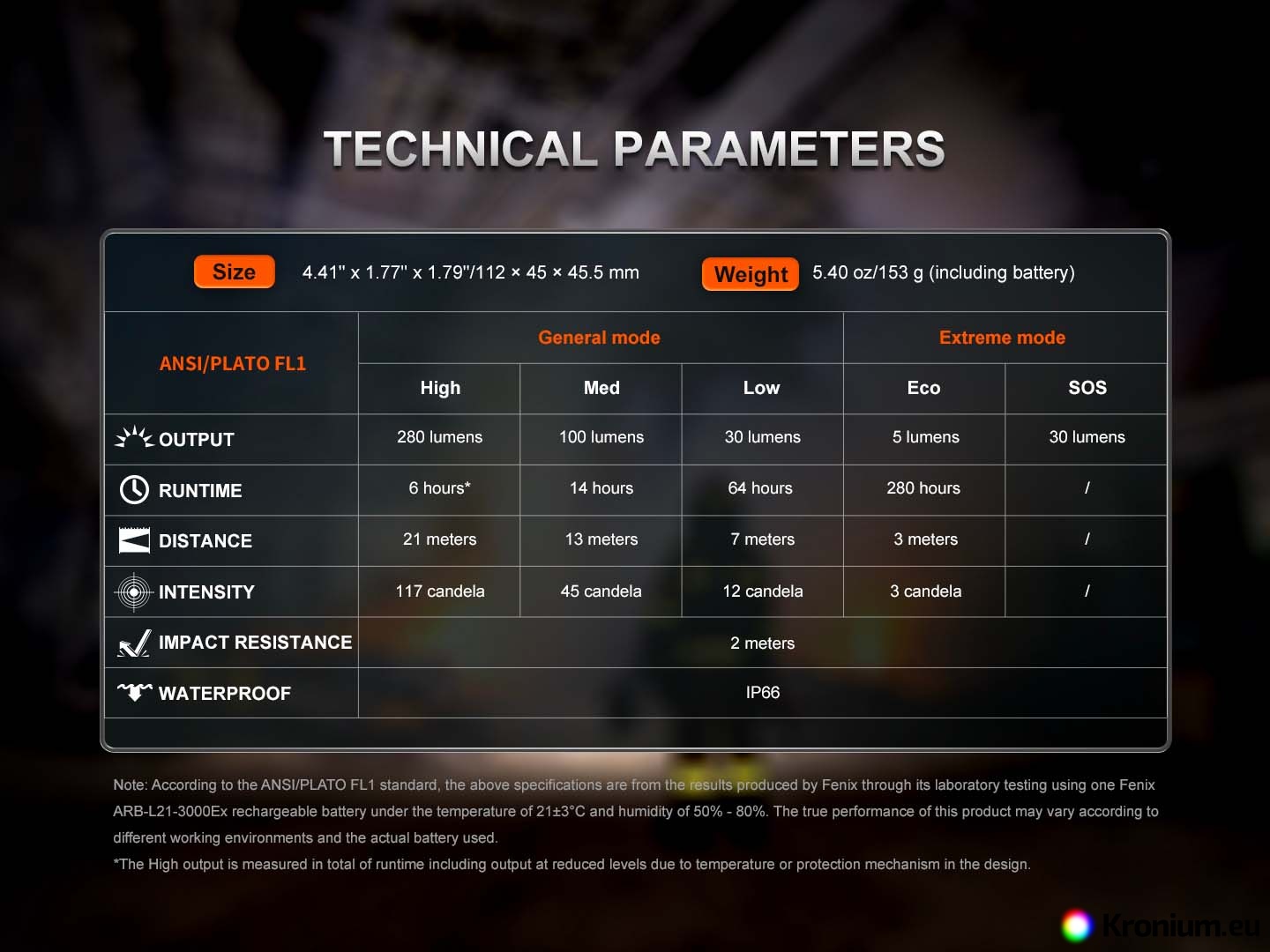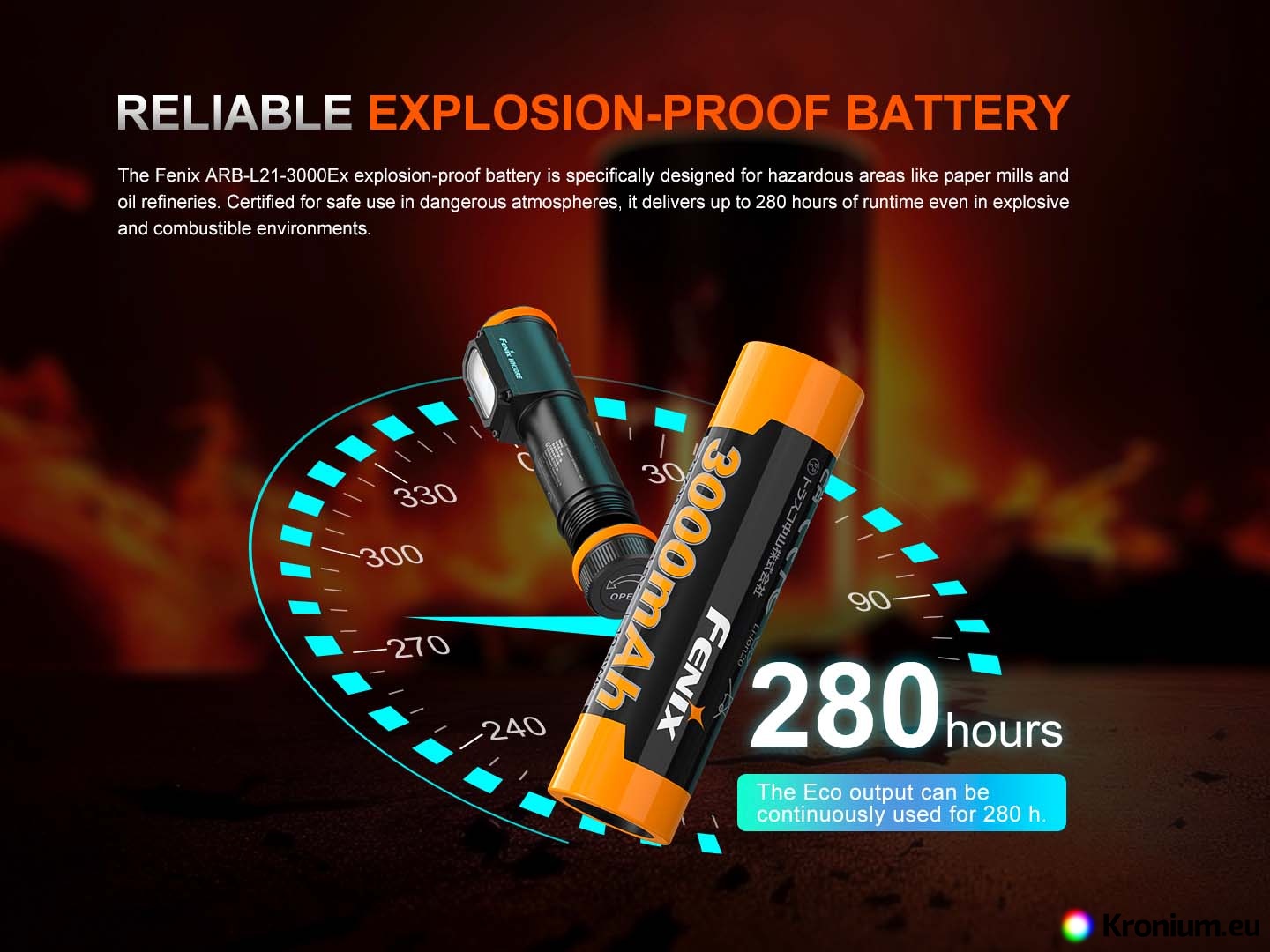 - Uses a special Fenix ARB-L21-3000Ex Li-ion battery with a capacity of 3000 mAh. This is a modified type certified for explosive environments.