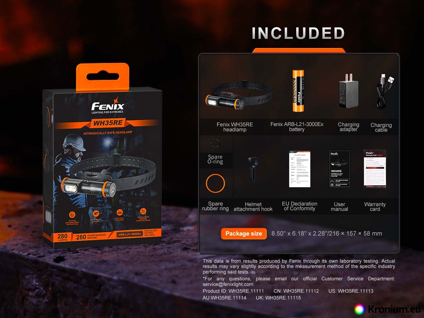 - Fenix WH35RE headlamp, Fenix ARB-L21-3200Ex battery, USB charging adapter, USB-C charging cable, EU Declaration of Conformity, spare O-ring, spare rubber ring, hook for helmet attachment, antistatic rubber head strap, sliding buckle, user manual, warranty card.