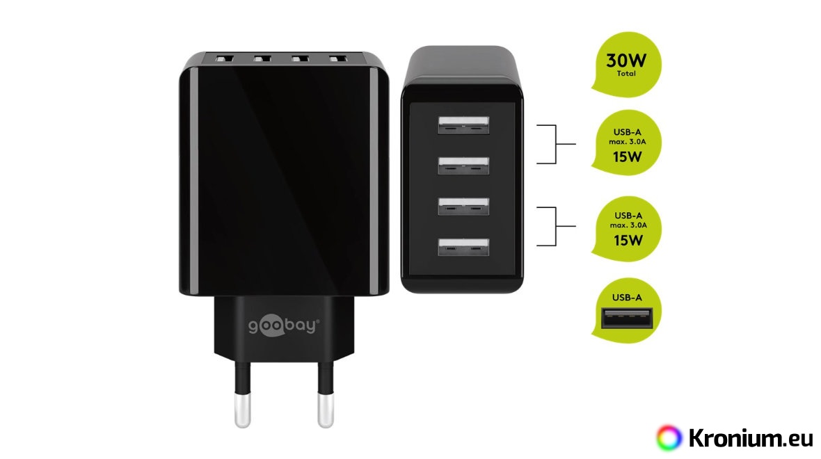 Intelligent adapter for powering up to four USB devices from 230V mains with a total power output of 30W. When connecting one to two devices, it can deliver up to 2x 3000 mA current at 5V (2x 15W), when connecting four devices, the output is 4x 1500 mA / 5V. Can be used with, for example, Fenix LR50R, LR40R V2.0, LR35R, TK26R, UC35, PD40R, E28R, E18R, BC30R, BC25R. Rechargeable headlamps HM70R, HM65R-T, HM65R, HM61R, HM51R, HM50R, HL60R, HL40R, HL32R, HL18R, HP30R, HP25R, HP16R, CL30R, CL26R, CL20R and to power USB chargers ARE-D1, ARE-D2, USB chargers SC1, USB chargers PB2S. However, the adapter can also be used to power and charge batteries with built-in micro-USB, USB-C, mobile phones, powerbanks, digital cameras, MP3 players and other USB devices.