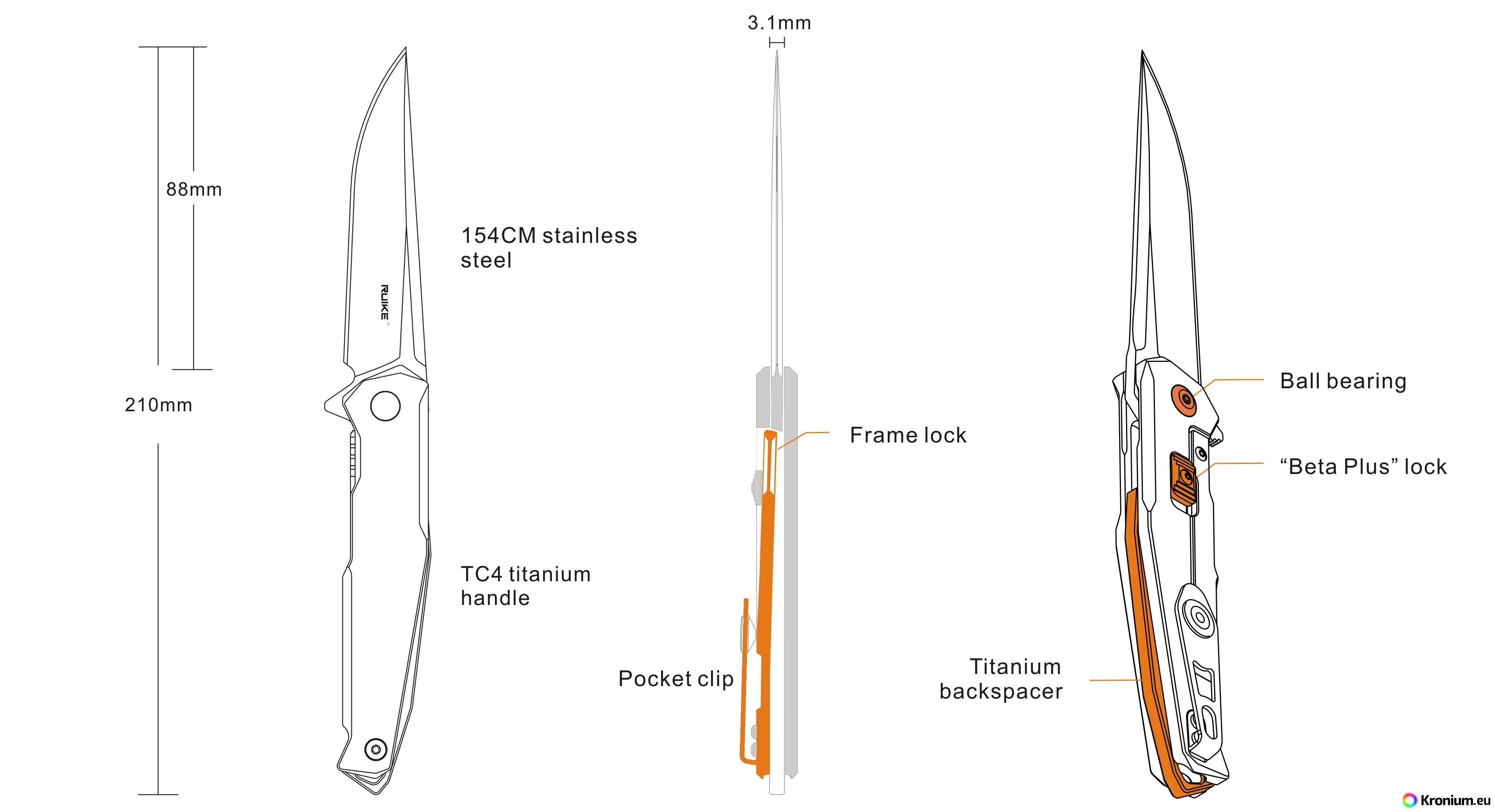 The blade of this Ruike knife is made of 154CM martensitic chrome-molybdenum steel from American manufacturer Crucible industries with optimized chemical composition and crystalline structure. The blade is mounted on a ball bearing. Ruike products meet the demands placed on professional knives such as blade hardness, sharpness, durability and corrosion resistance.