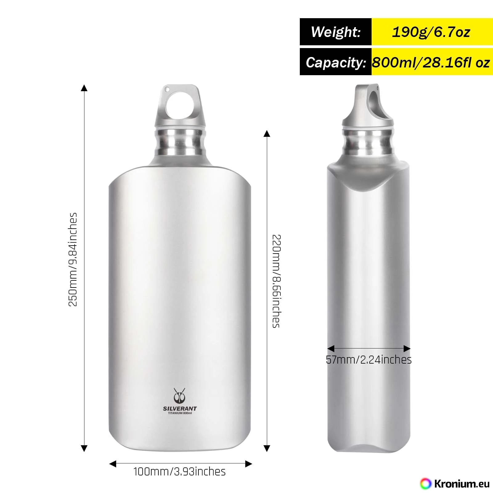 The ultra-lightweight, durable 800ml SilverAnt titanium alloy bottle is made for a lifetime of adventure. Carry your favorite beverage with you everywhere, to the office, while playing sports, hiking and traveling. The practical flat slim shape doesn't get in the way in backpack and fits better in the side pockets. The bottle has a cap with a loop, so it can be attached to a carabiner. It comes with a thermo sleeve, you can enjoy your coffee and tea hotter for longer and in summer the sleeve keeps your chilled drinks at the optimal temperature. The material does not impart any aftertaste or odour to the liquids carried inside. It is BPA-free and corrosion resistant.